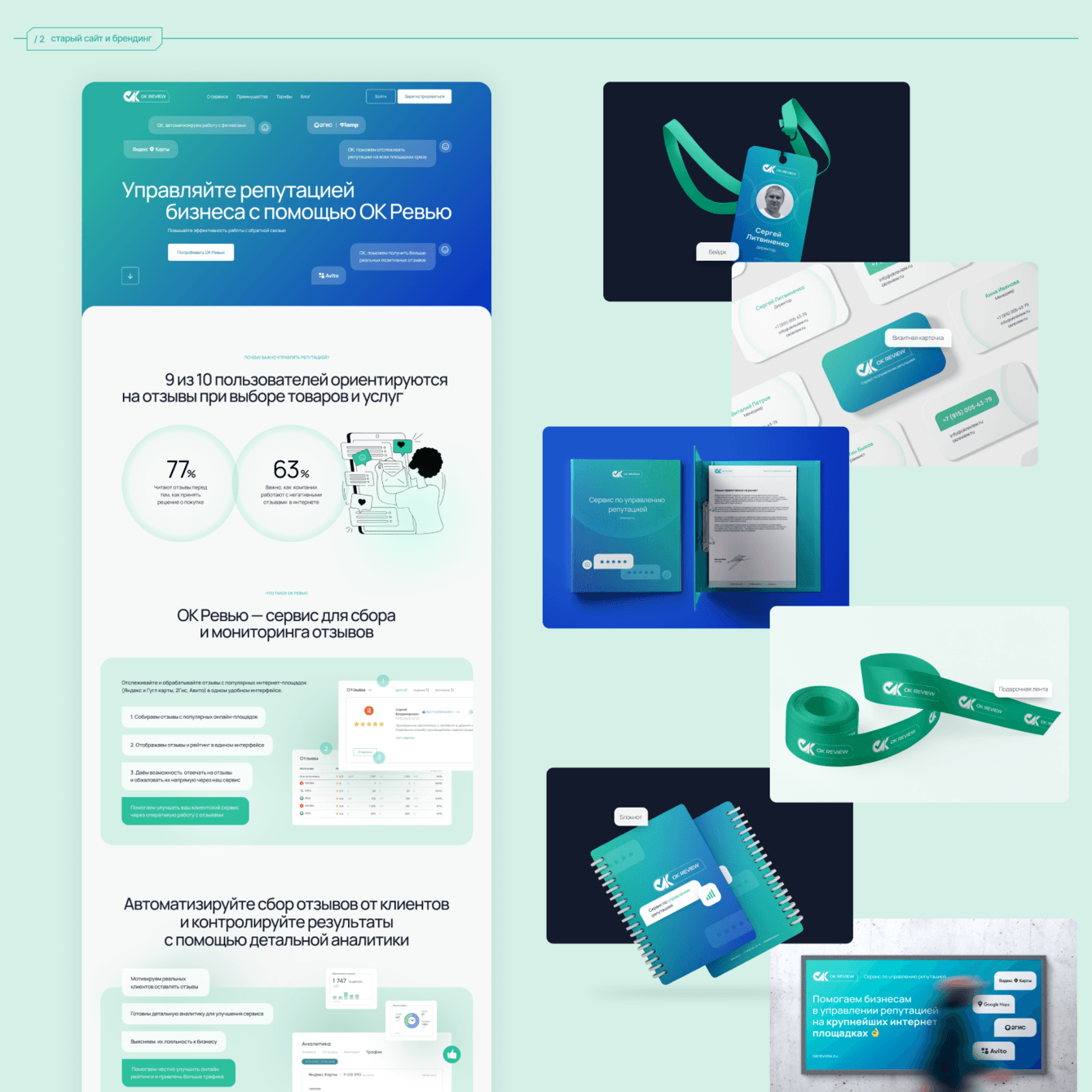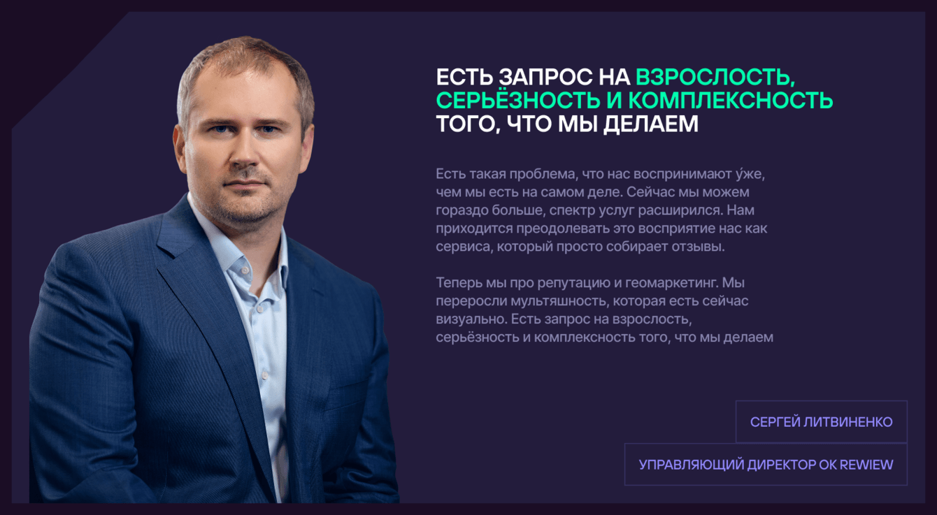 Всегда классно, когда клиенты растут вместе с нами. Предыдущую версию сайта Ок Ревью делала я, как одинокий фрилансер — агентства у меня тогда не было, а задачи о Ок Ревью были не такие масштабные — нужно было всего лишь освежить дизайн и сделать лендосик. Тогда визуальные идеи из лендосика легли и в основу фирменного стиля, и так компания просуществовала еще 2.5 года, пока не обратилась ко мне снова — только уже в агентство, за полным ребрендингом и более серьезной и взрослой версией сайта.