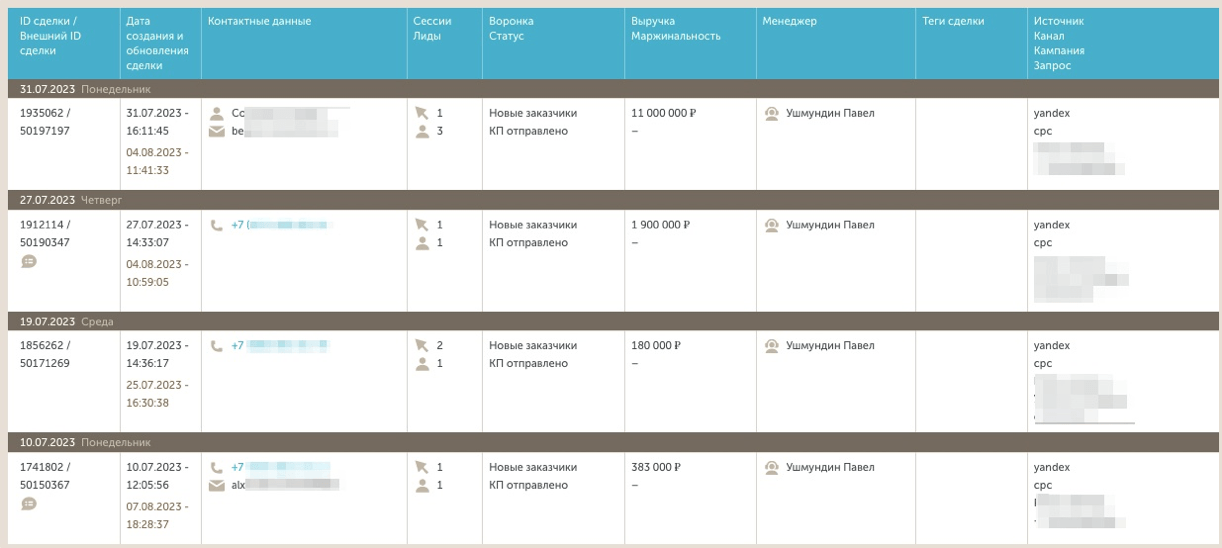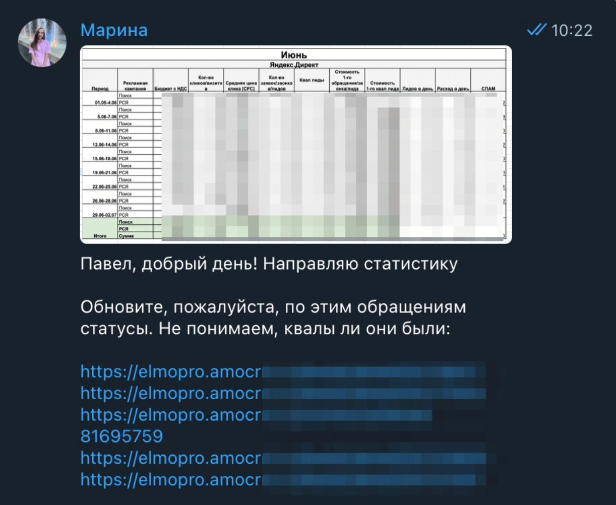 Плюс 2 раза в неделю мы предоставляем отчетность клиенту по основным показателям: потраченный бюджет, стоимость целевой заявки, смотрим динамику по продажам в CRM-системе клиента.