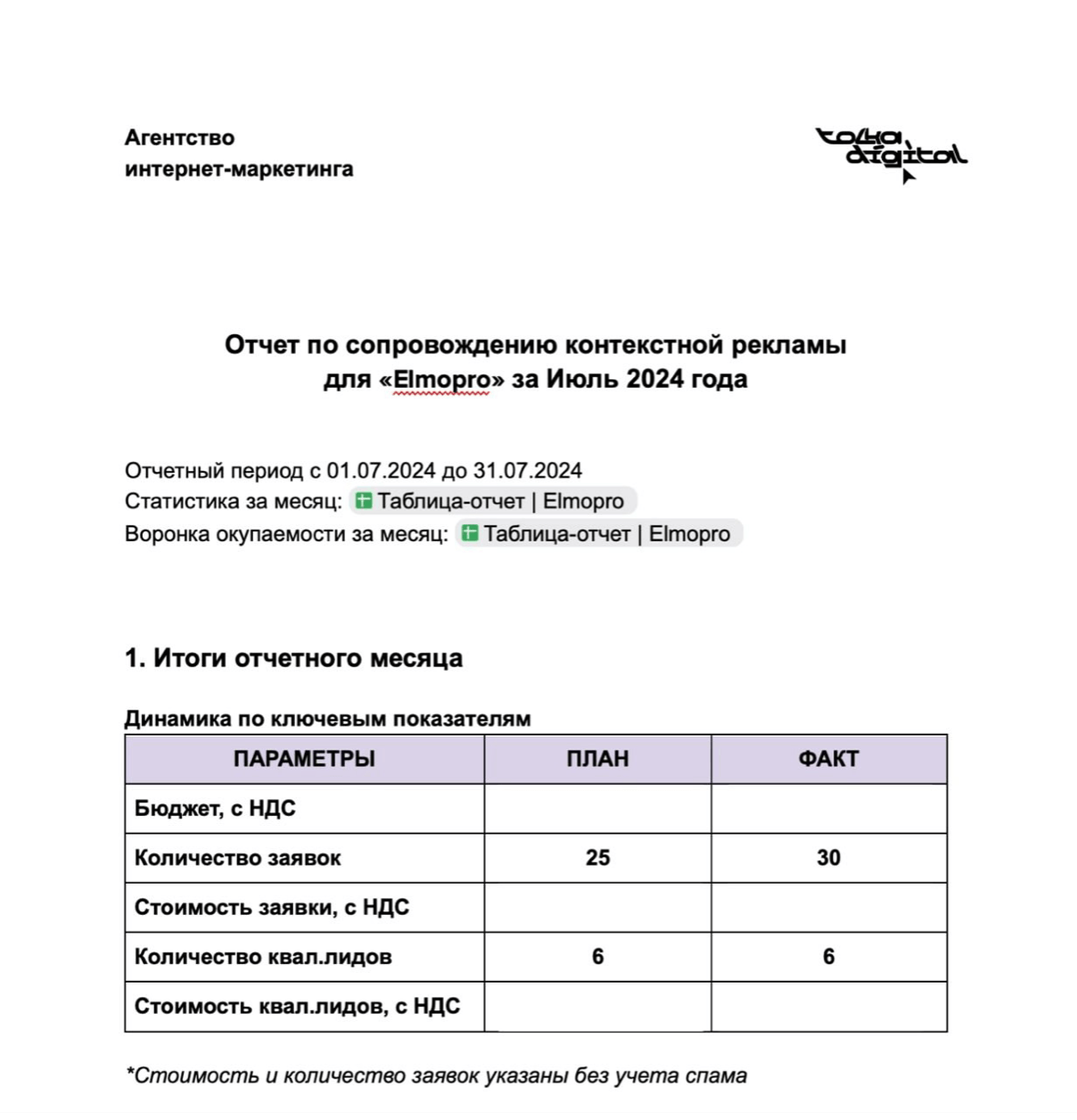 Каждый месяц делаем отчет о проделанной работе, полученных показателях и ставим план на следующий месяц по показателям и задачам, отталкиваясь от целей клиента по выручке и в целом по бизнесу.