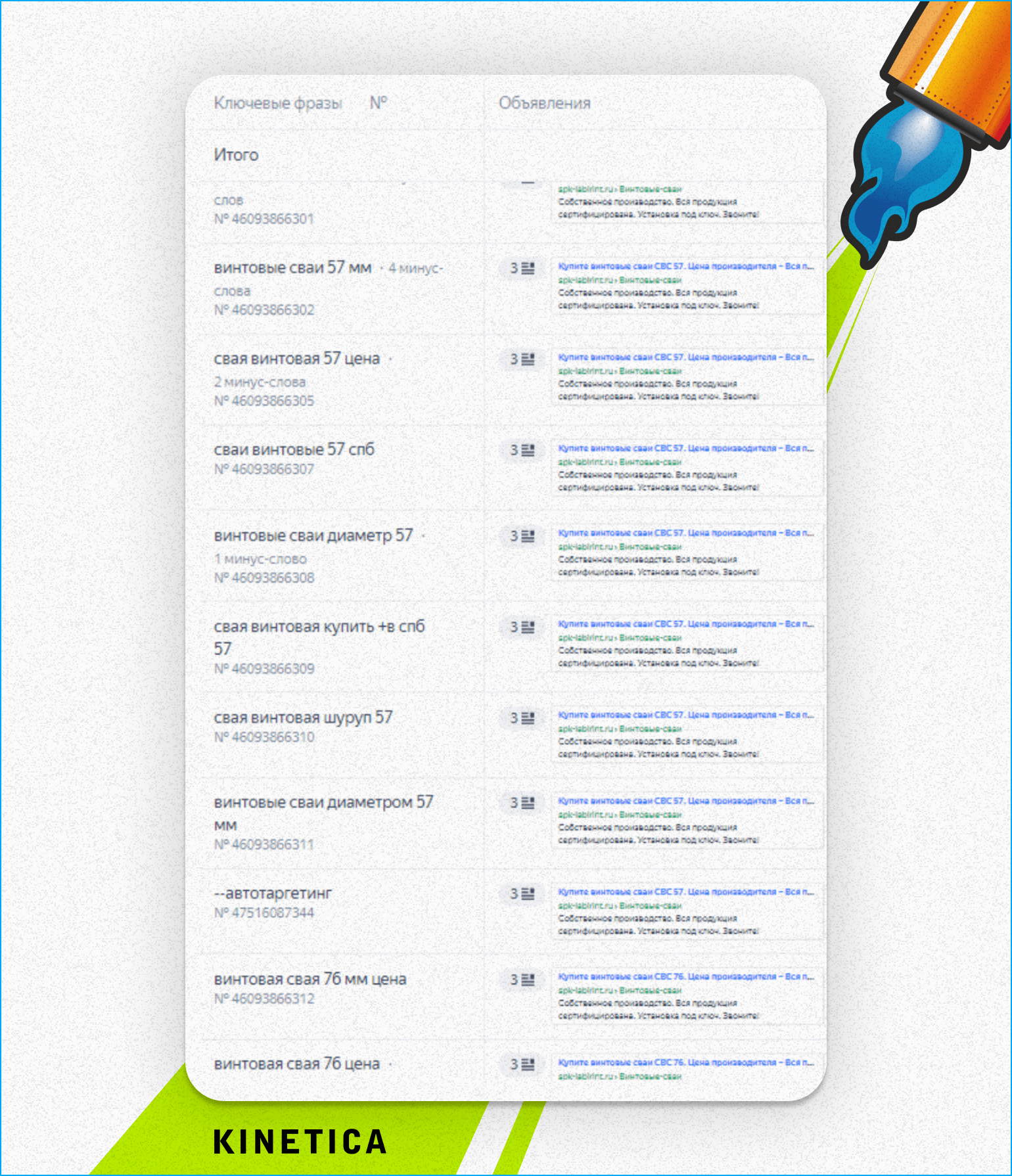 Группы формировали на основе изученной продукции и частоты показов. Каждая из них включала в себя схожие по смыслу словосочетания, например, по типам винтовых свай или их диаметрам. За счет этого мы смогли избежать «размывания» семантики и создать максимально целевые объявления для каждой категории товаров.