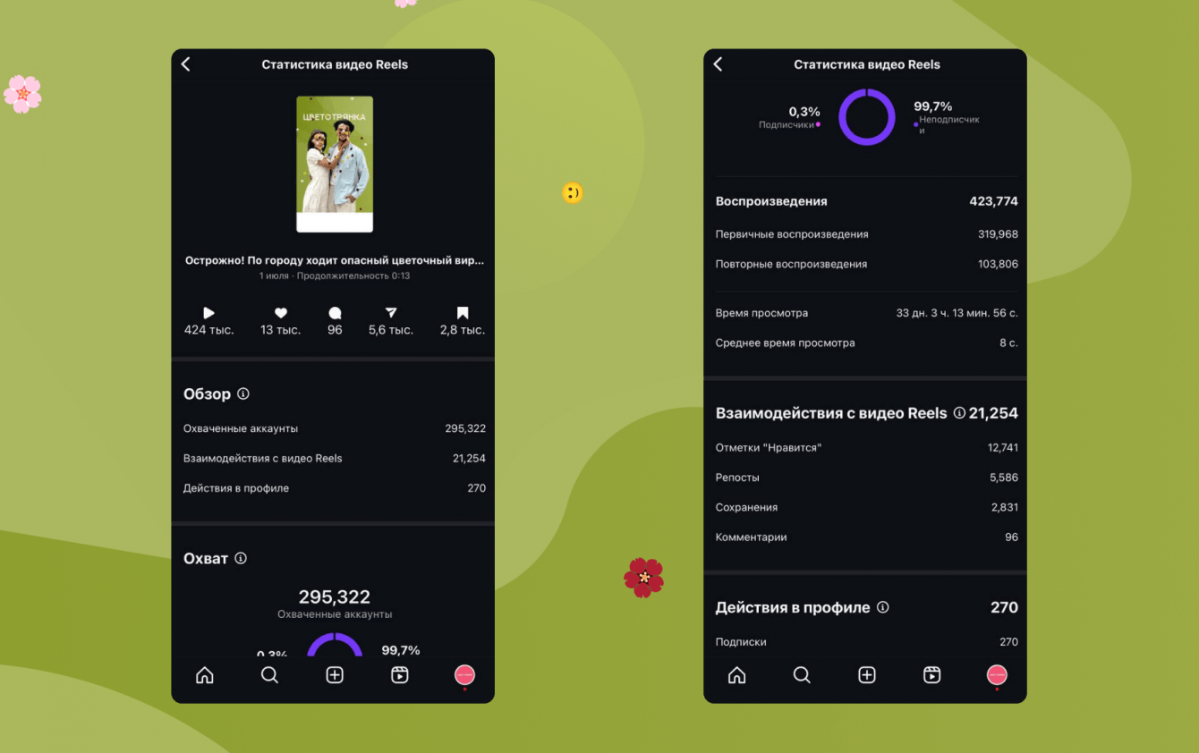 1. Ролик получил высокий органический охват, собрав 423 тыс. просмотров и став одним из самых обсуждаемых видео среди аудитории.