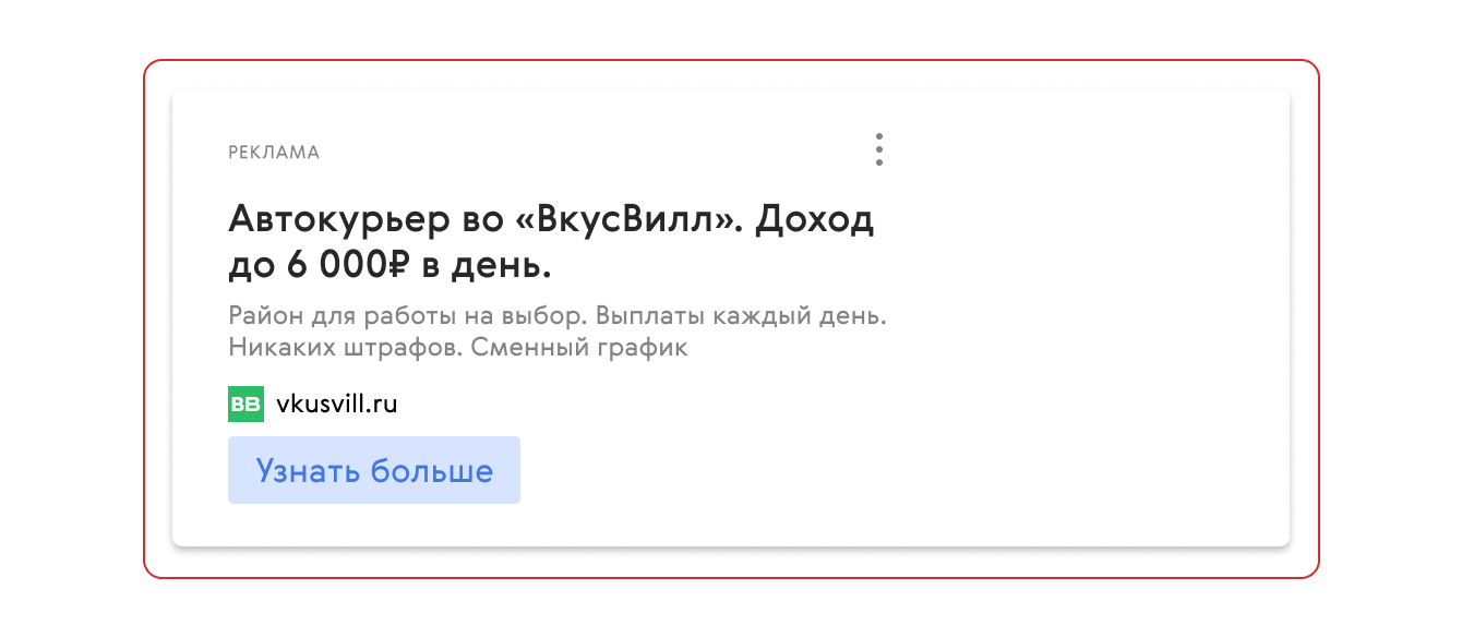 Конкурировать с известными сервисами доставки в регионах было сложно. Мы искали решение, которое поможет выделить объявления среди известных брендов. В итоге решили попробовать вынести все преимущества работы во «ВкусВилл» сразу в объявления.