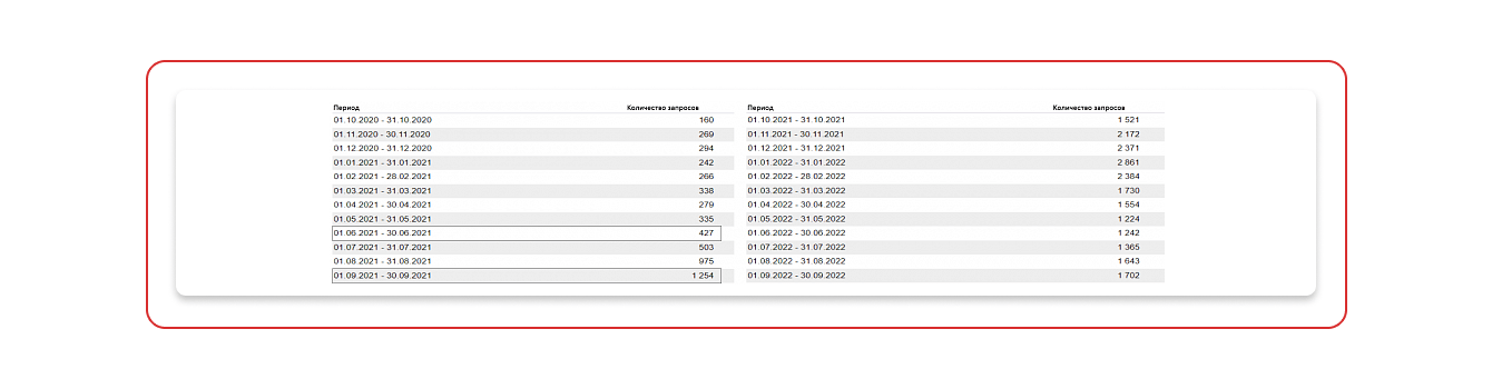 На скриншоте показан рост количества запросов фразы «вкусвилл курьер» в регионах, разбитый по месяцам. И если в июне 2021 года было 427 таких запросов, то в сентябре количество выросло до 1 254 запросов.