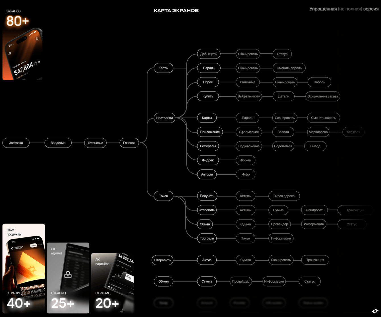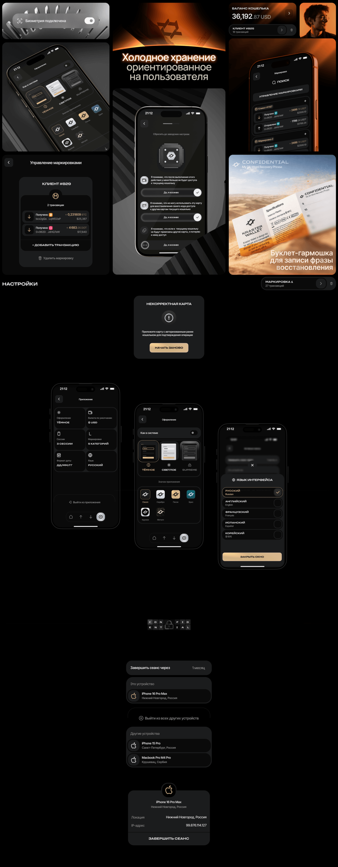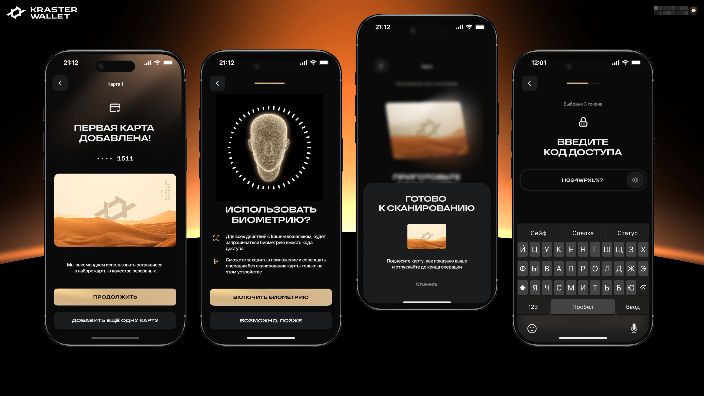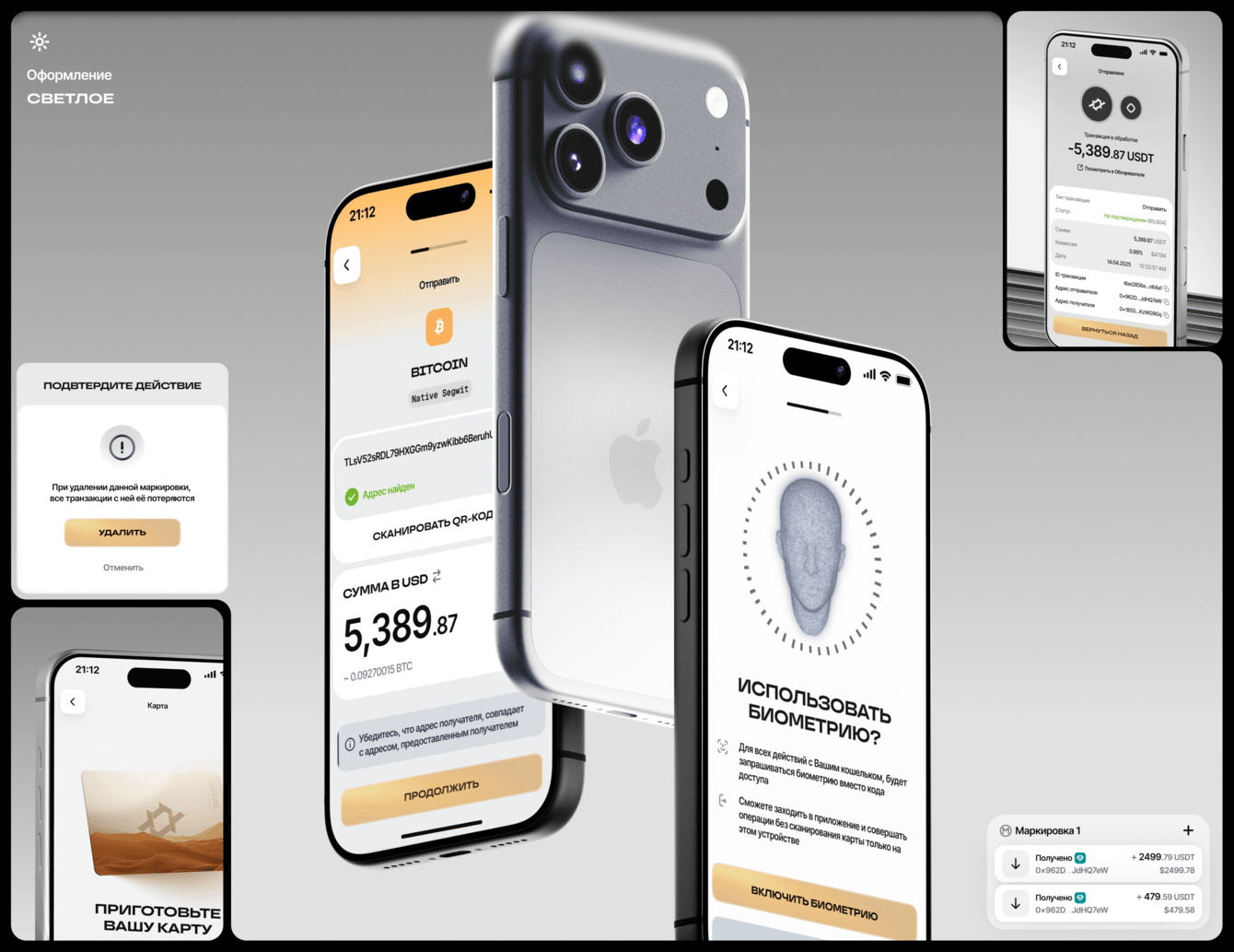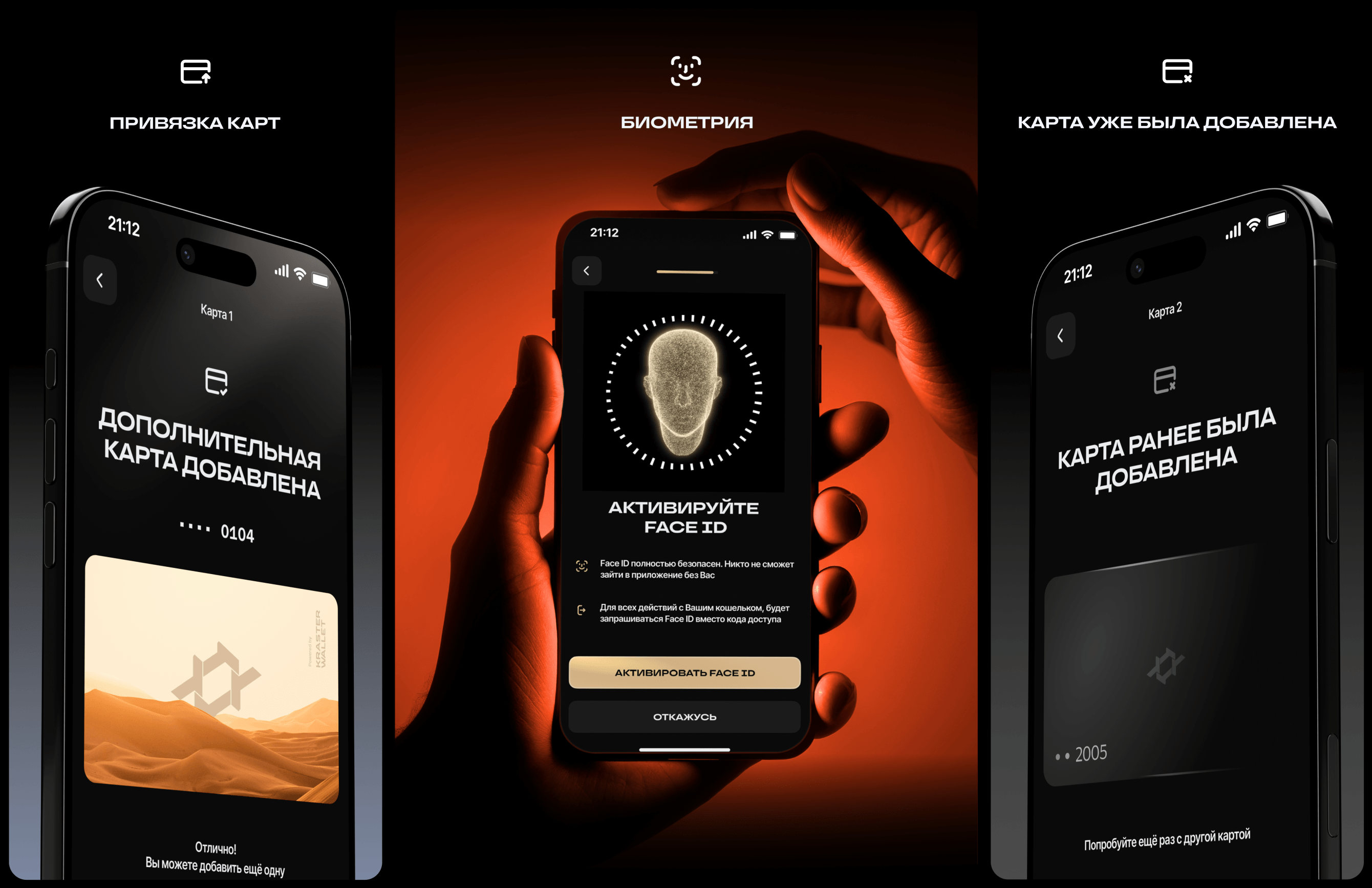 Для защиты от несанкционированного доступа к криптоактивам, были разработаны и задизайнены экраны прохождения биометрии установка seed-фразы из 12-24 слов, синхронизация доп. карт и настройка кода доступа с индикатором силы пароля. Из данного перечня, в процессе начала работы, можно пропустить лишь биометрию и сканирование доп. карт на начальном этапе.