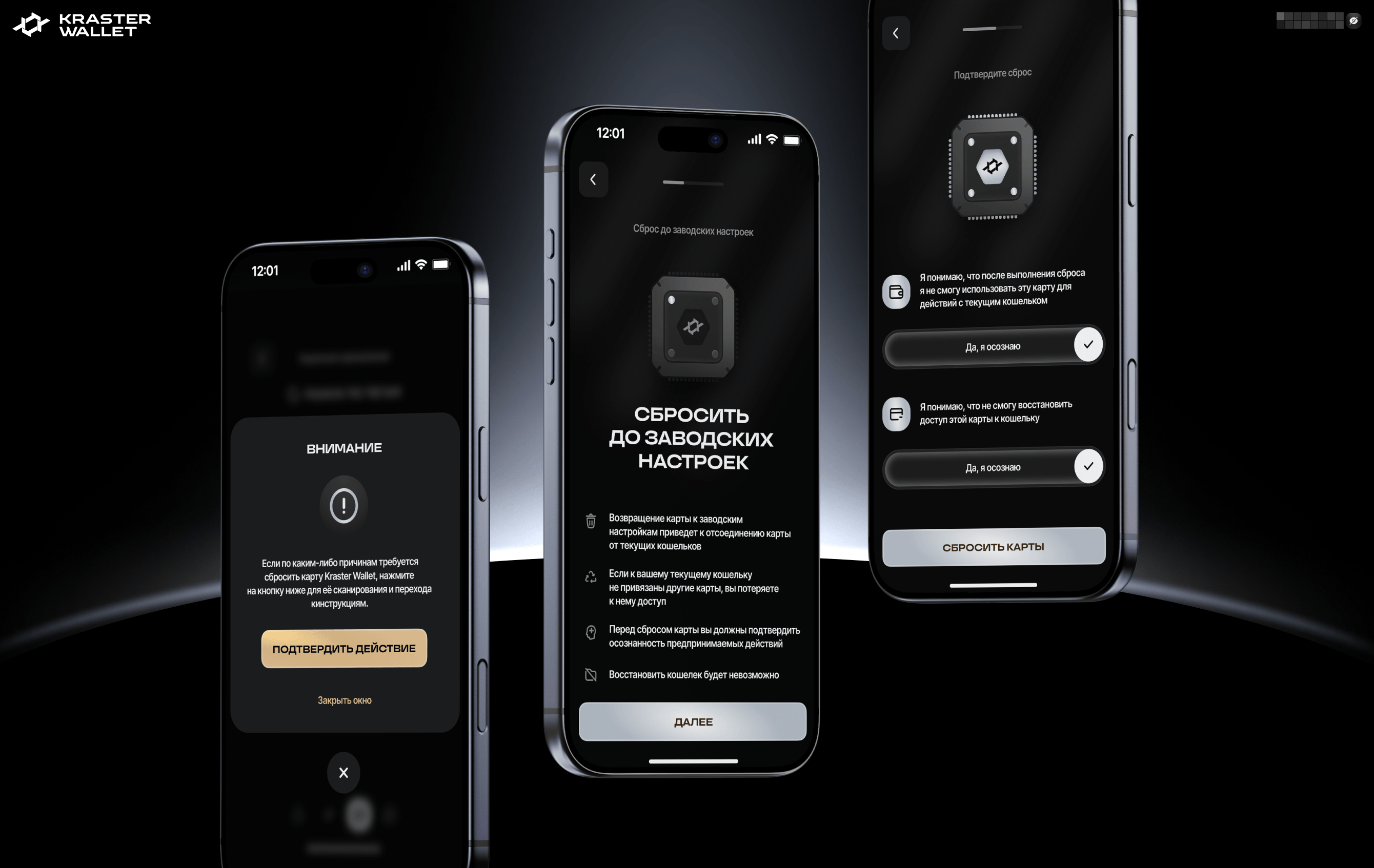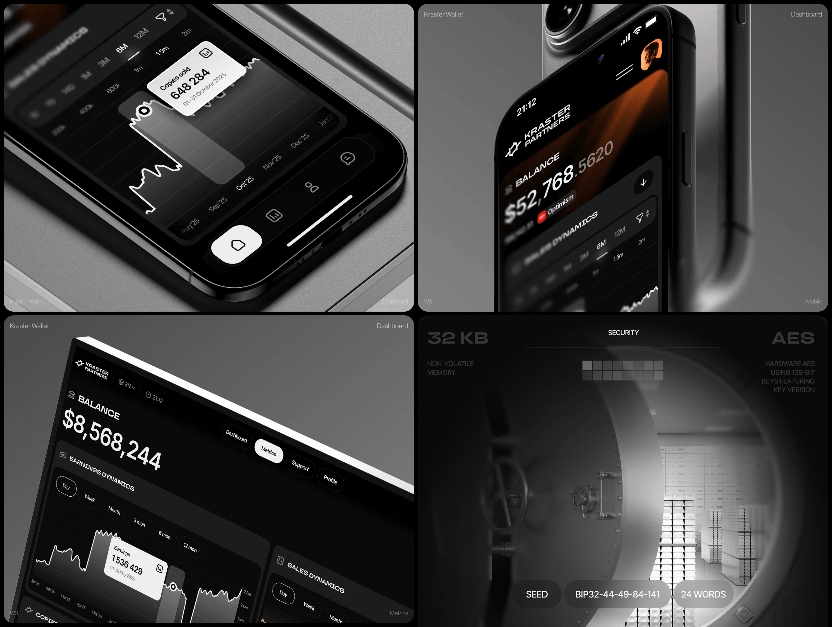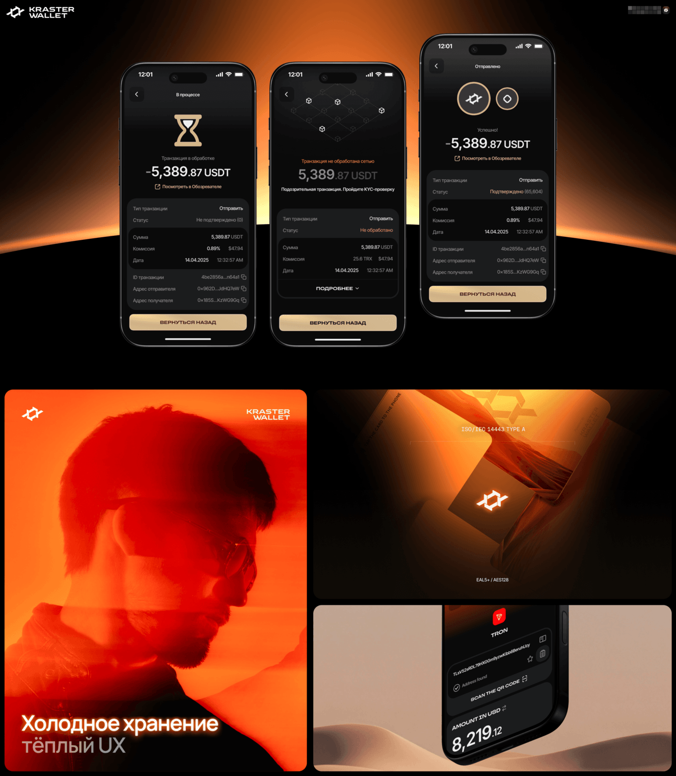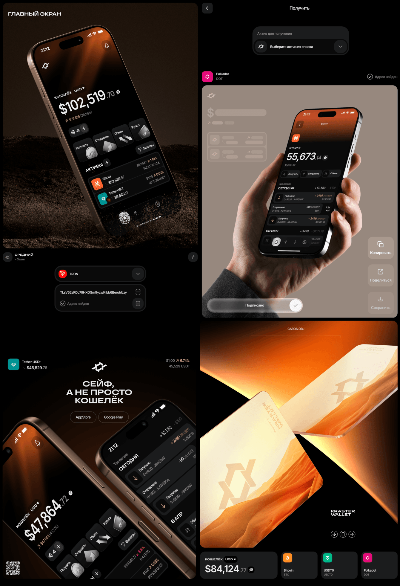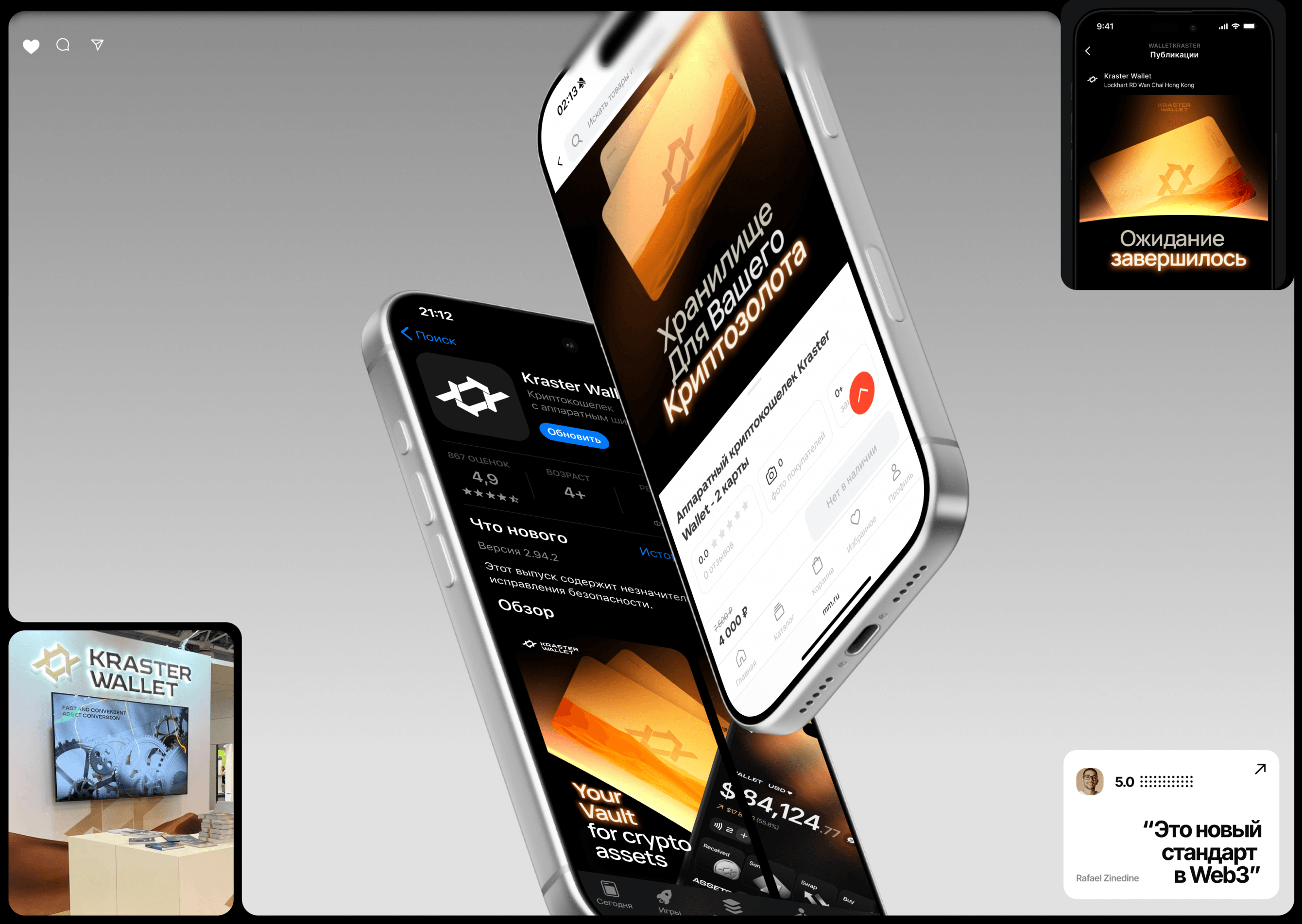Главная проблема традиционных холодных кошельков — перегруженные, утилитарные и зачастую устаревшие интерфейсы. Kraster Wallet решает это за счет премиального цифрового опыта. Телефон берет на себя удобную визуализацию и управление без лишнего шума, а карта работает как физический vault-ключ.