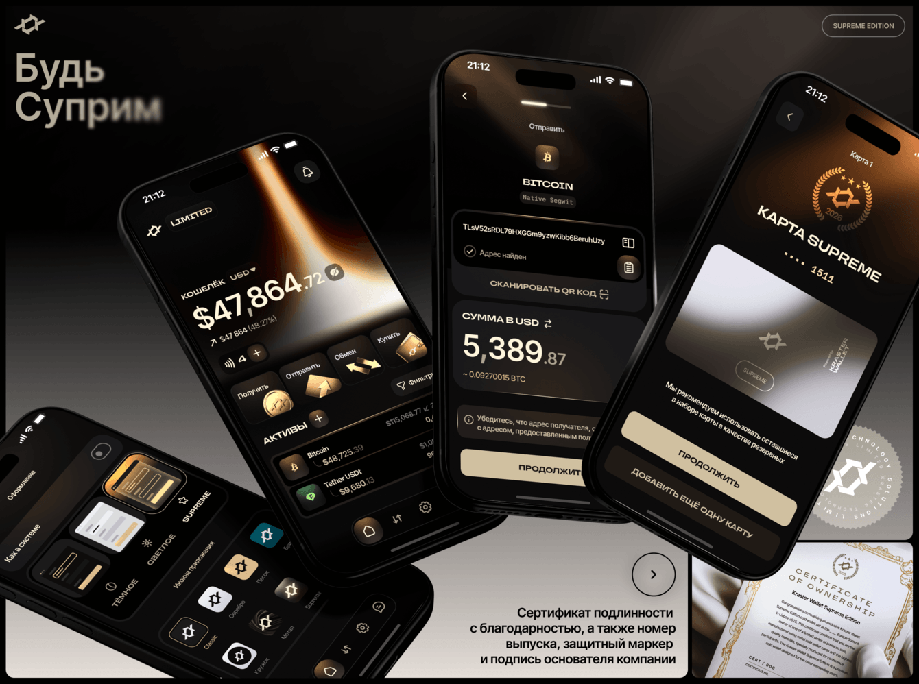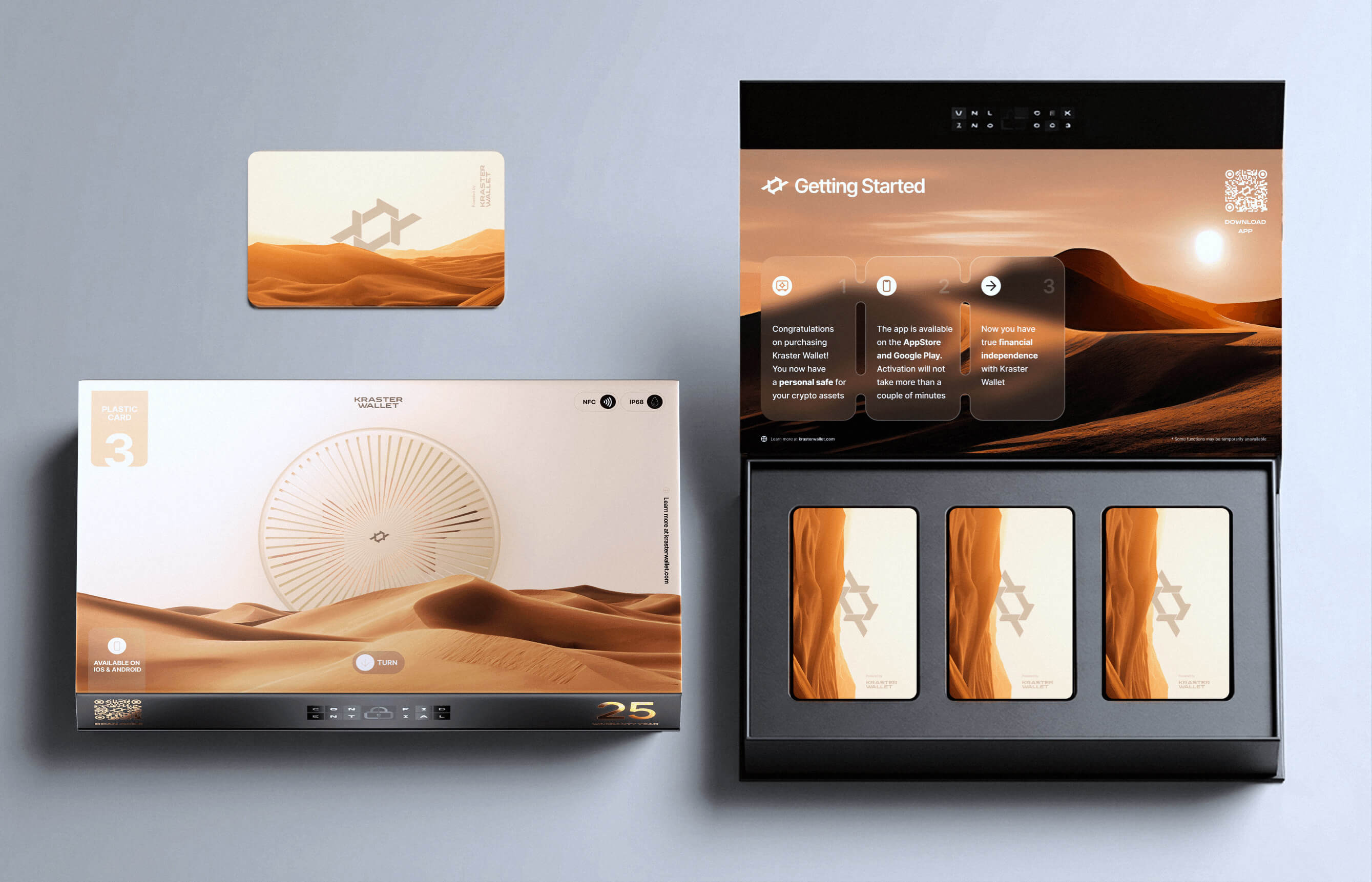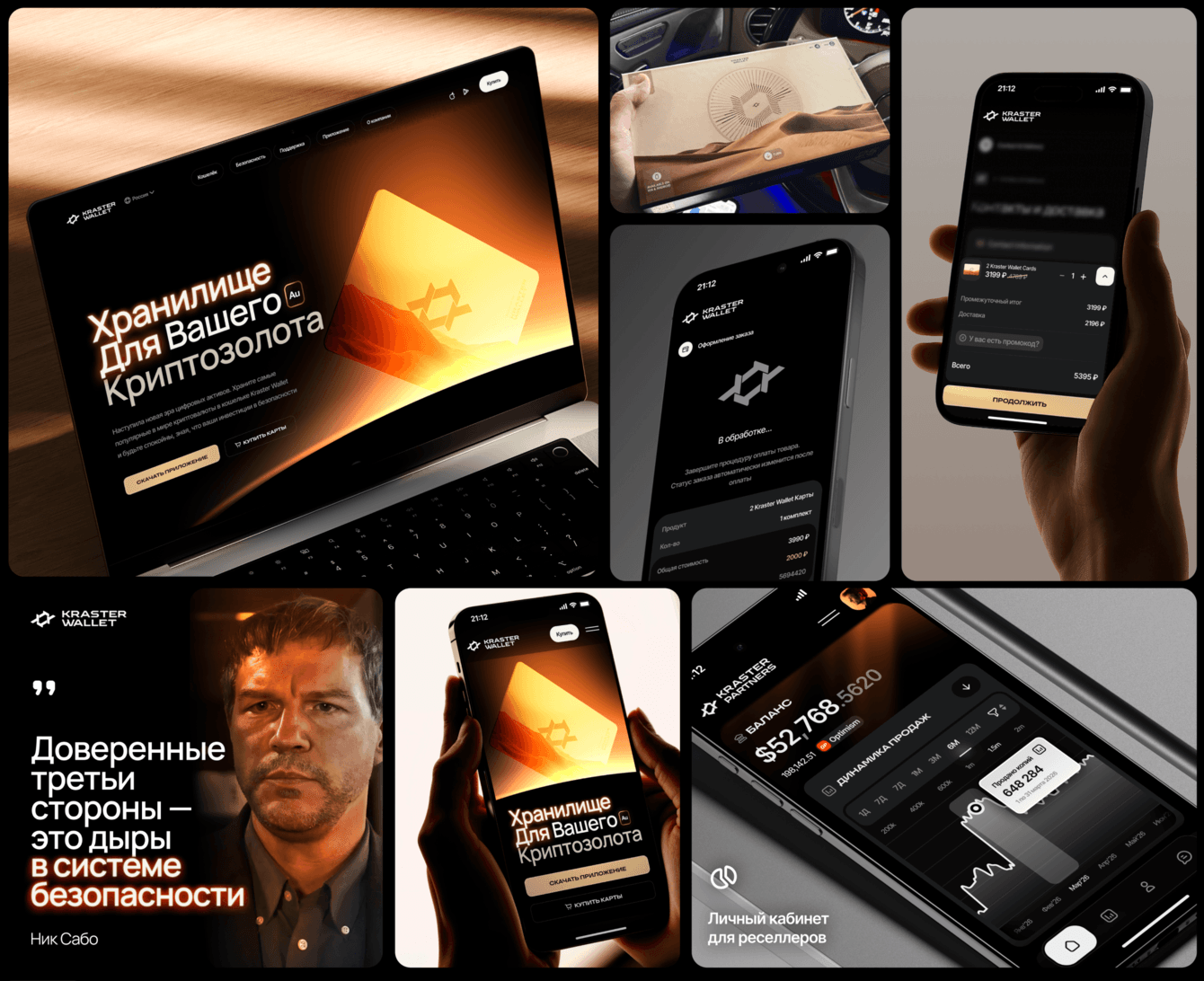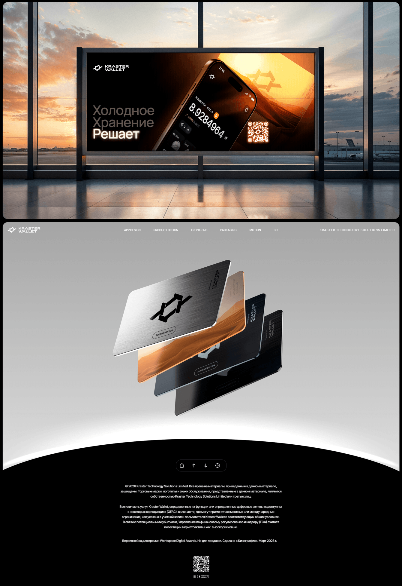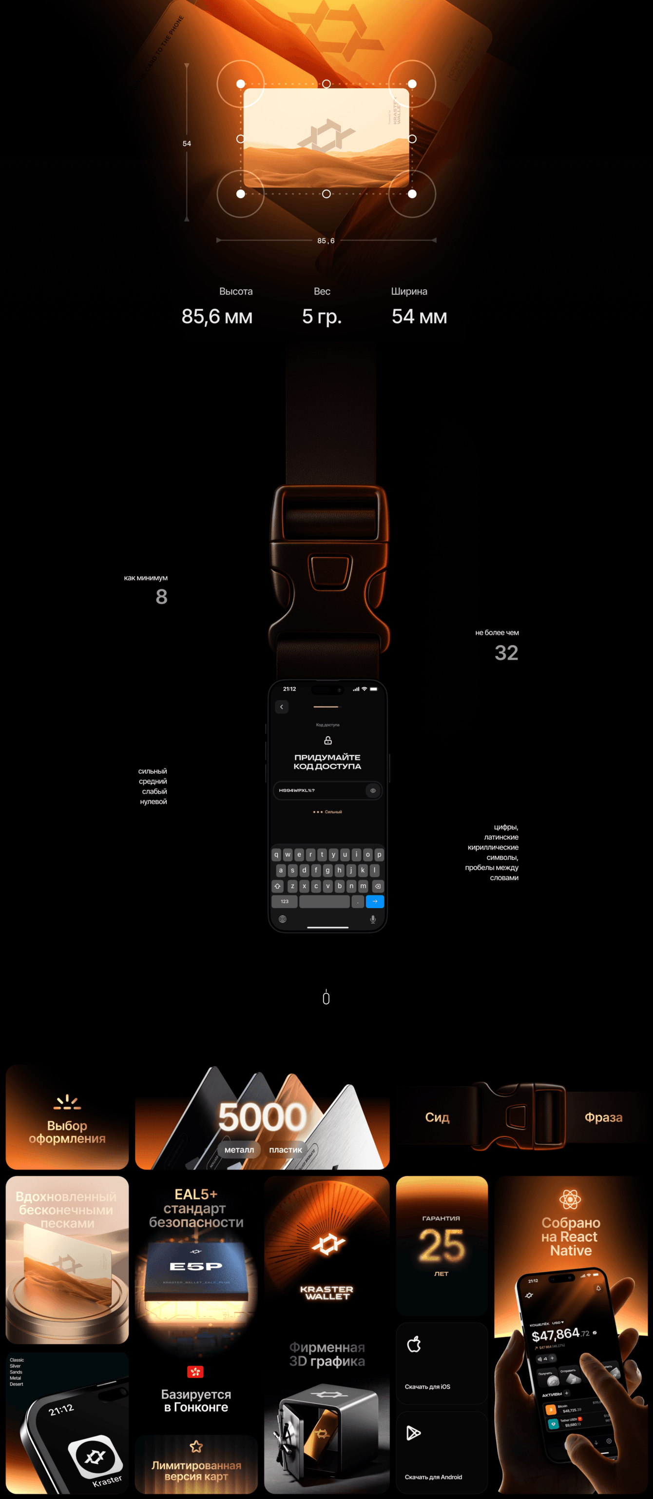 Главная проблема традиционных холодных кошельков — перегруженные, утилитарные и зачастую устаревшие интерфейсы. Kraster Wallet решает это за счет премиального цифрового опыта. Телефон берет на себя удобную визуализацию и управление без лишнего шума, а карта работает как физический vault-ключ.