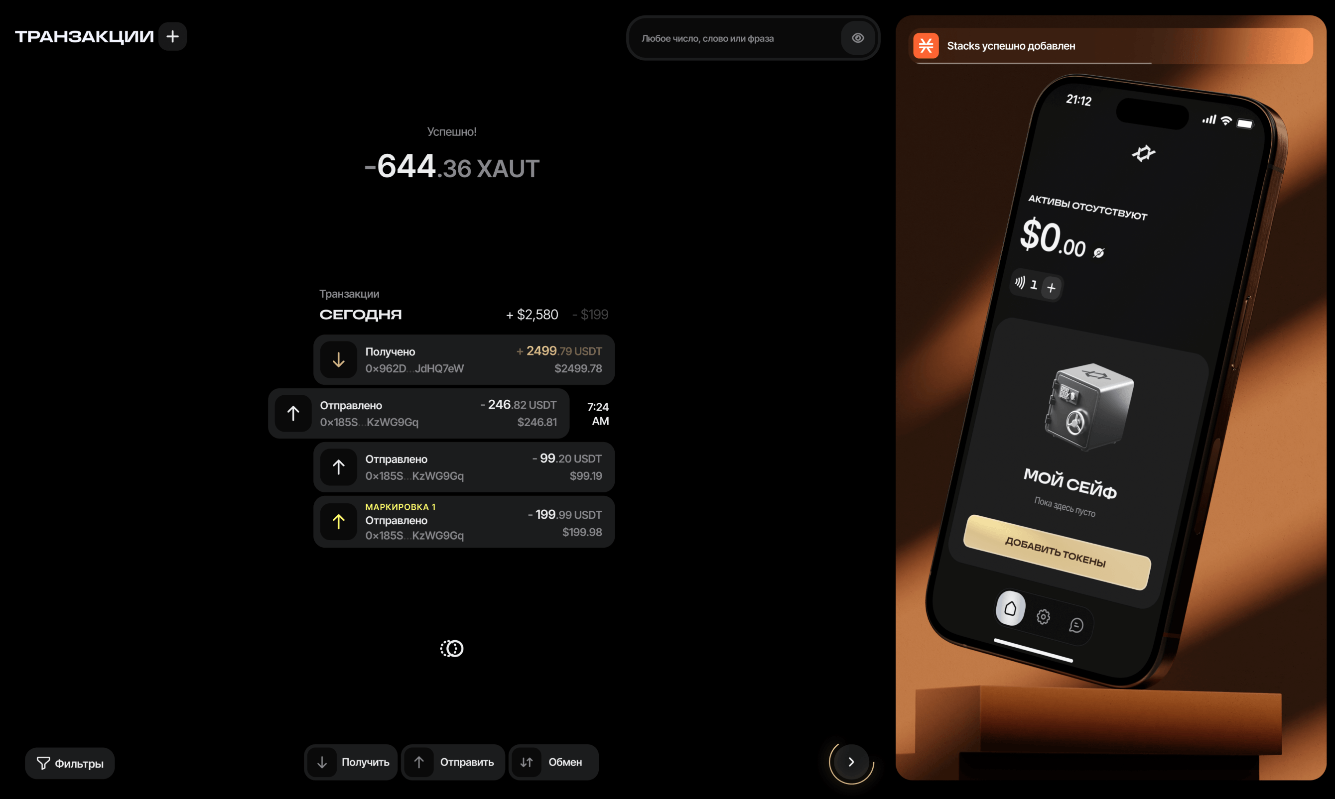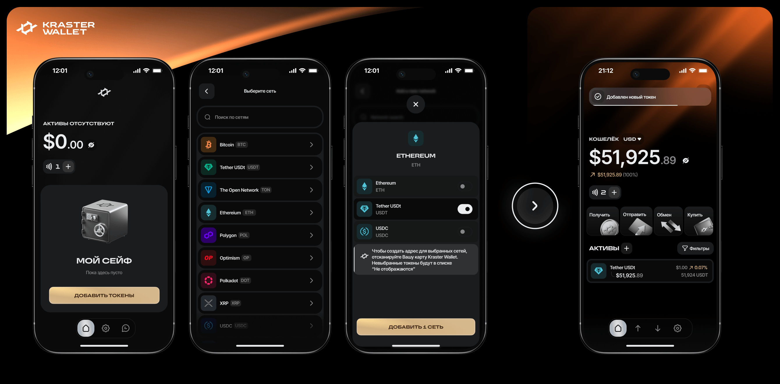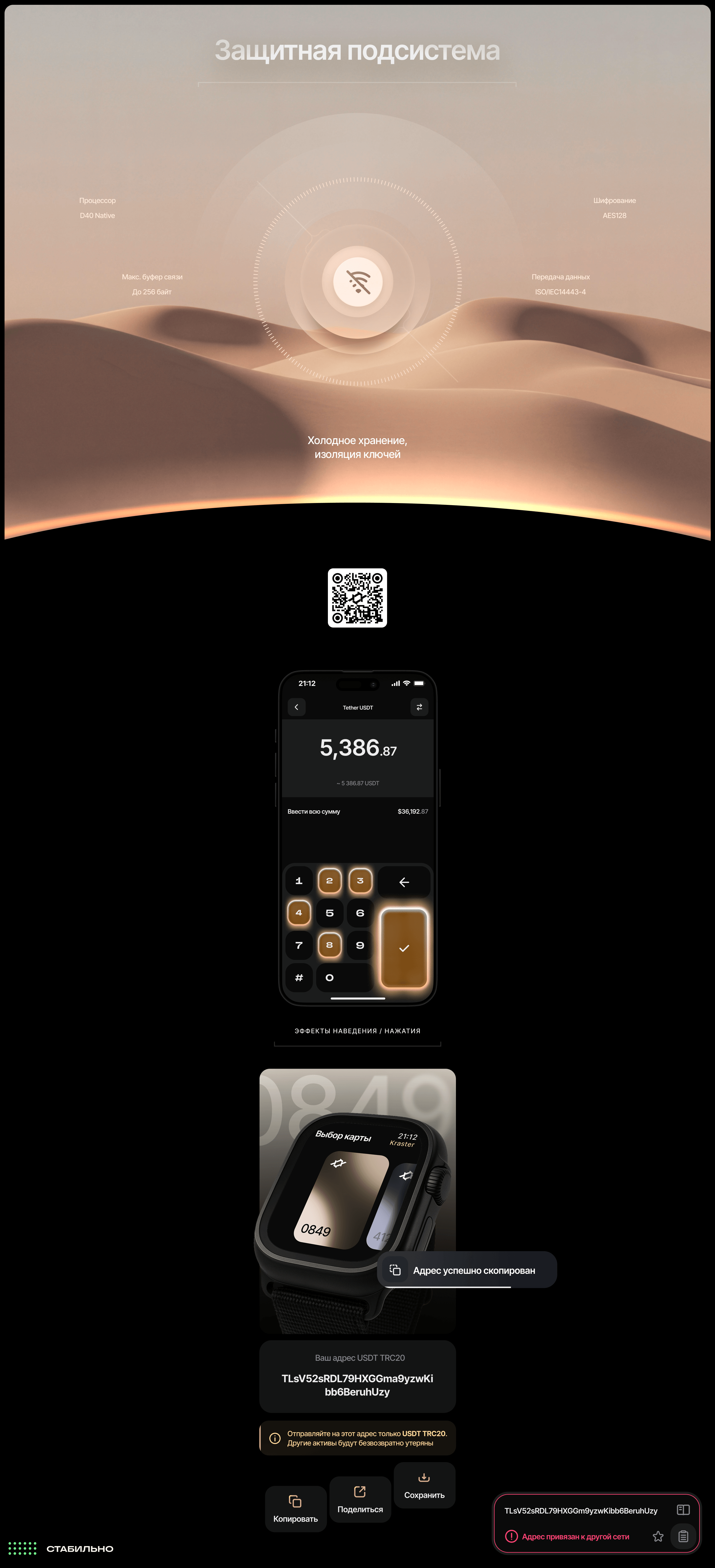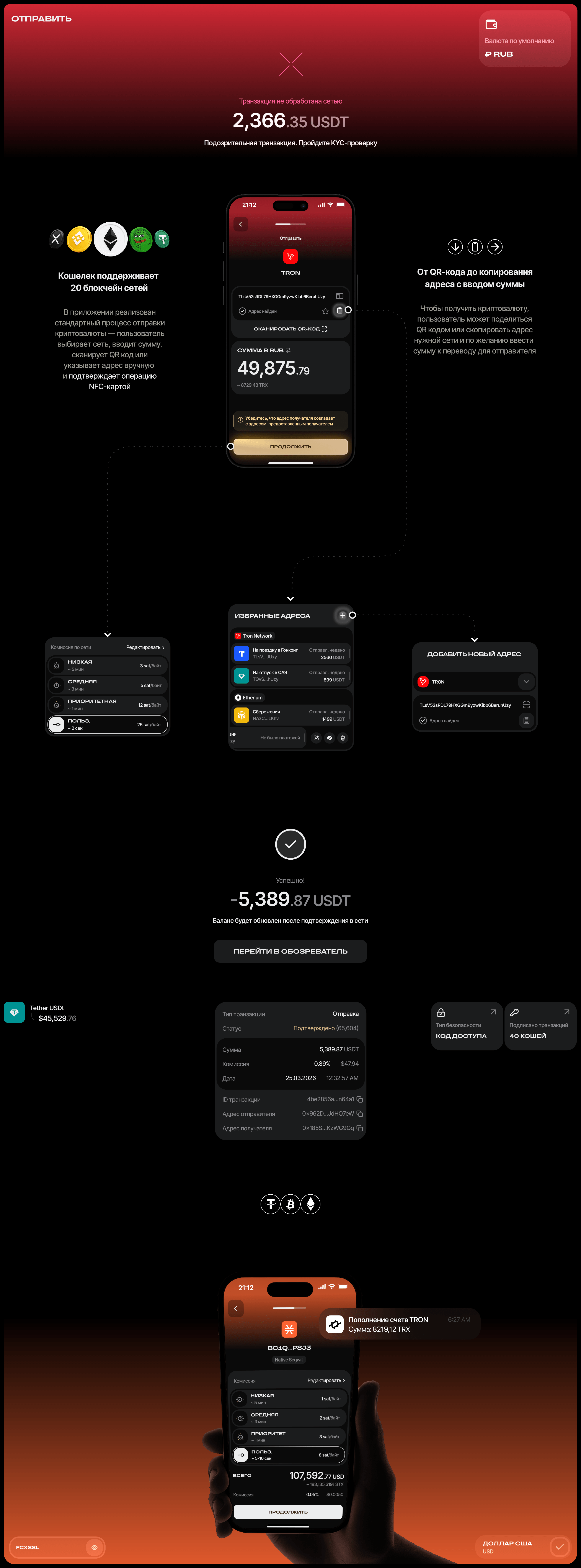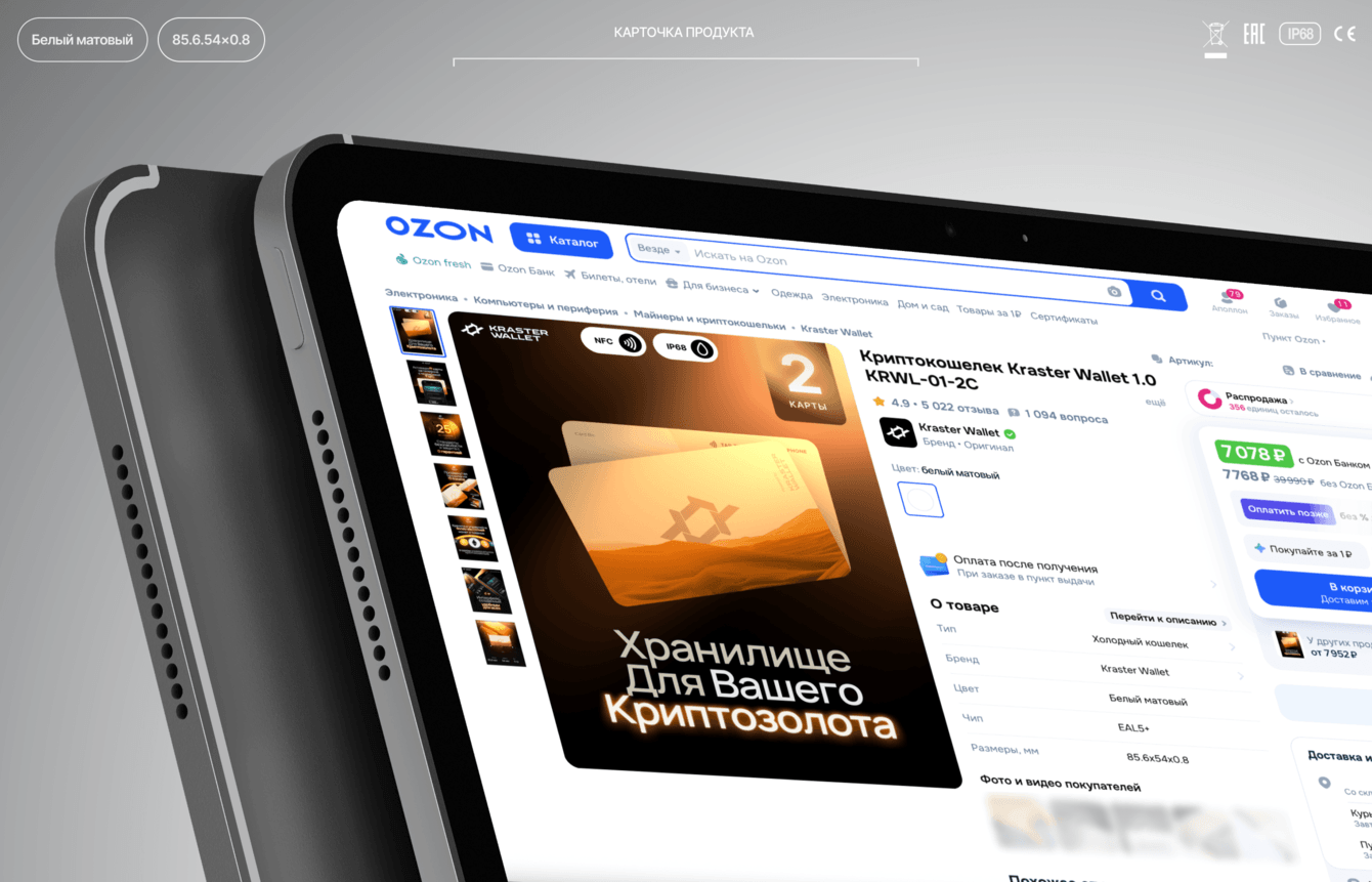 Главная проблема традиционных холодных кошельков — перегруженные, утилитарные и зачастую устаревшие интерфейсы. Kraster Wallet решает это за счет премиального цифрового опыта. Телефон берет на себя удобную визуализацию и управление без лишнего шума, а карта работает как физический vault-ключ.