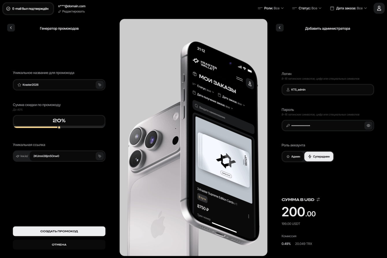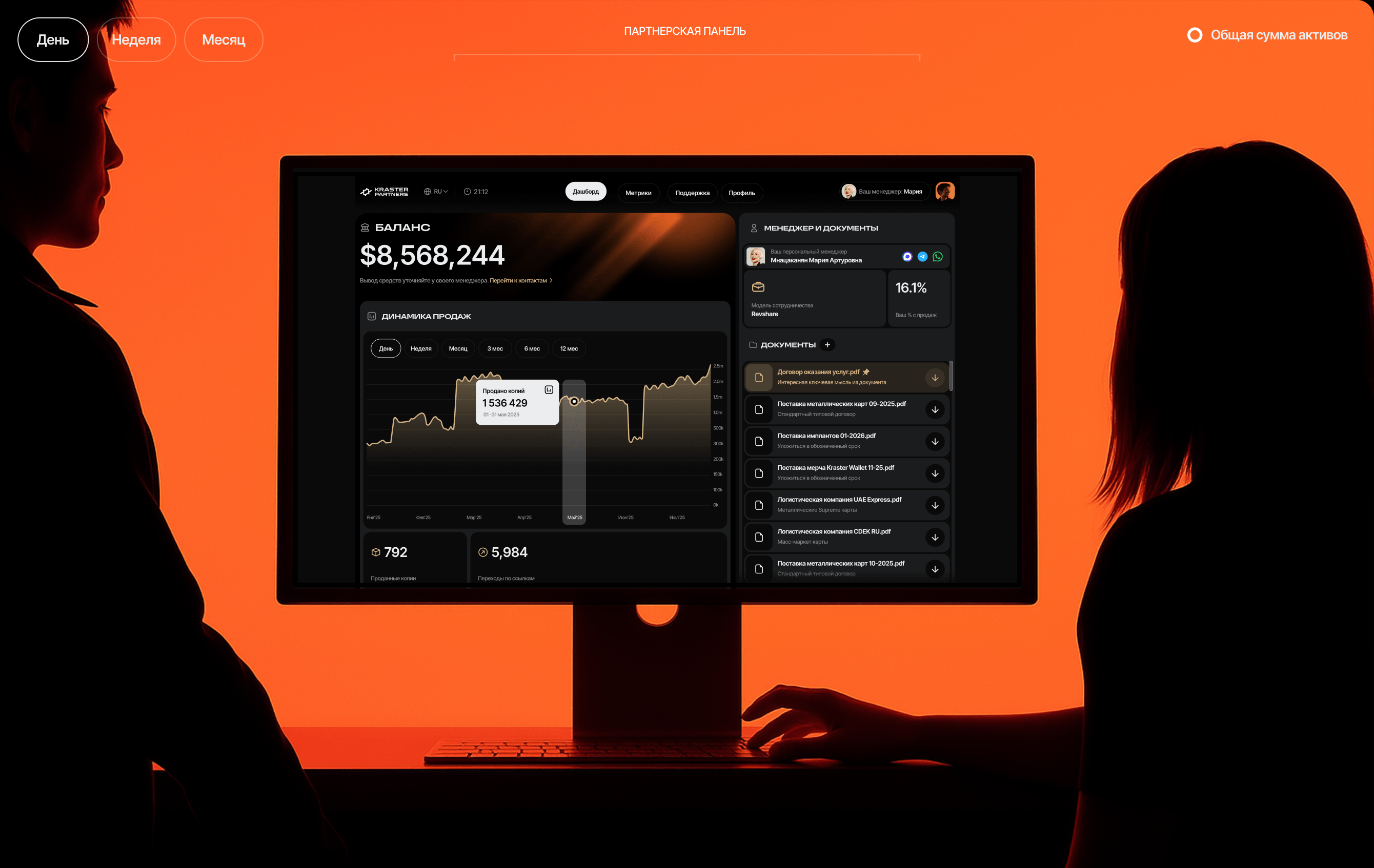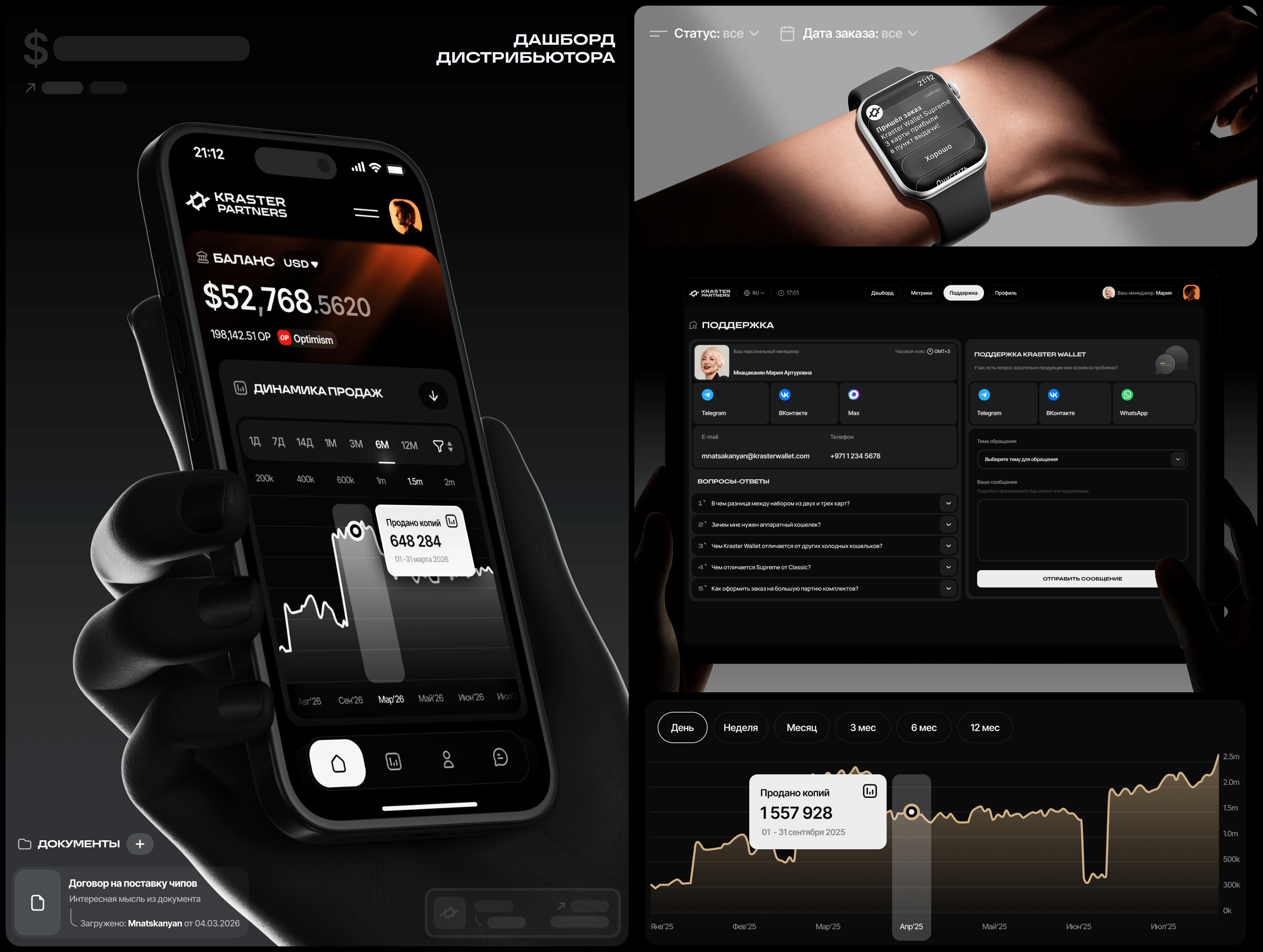 Развернутая B2B-инфраструктура. Приложением для iOS и Android мы не ограничились и перешли к партнёрской панели — платформа ориентированная на дистрибьюторов продукции Kraster Wallet. Для дистрибьюторов предусмотрена специальная партнерская панель и CRM, выполненная в едином визуальном стиле с основным пользовательским приложением.