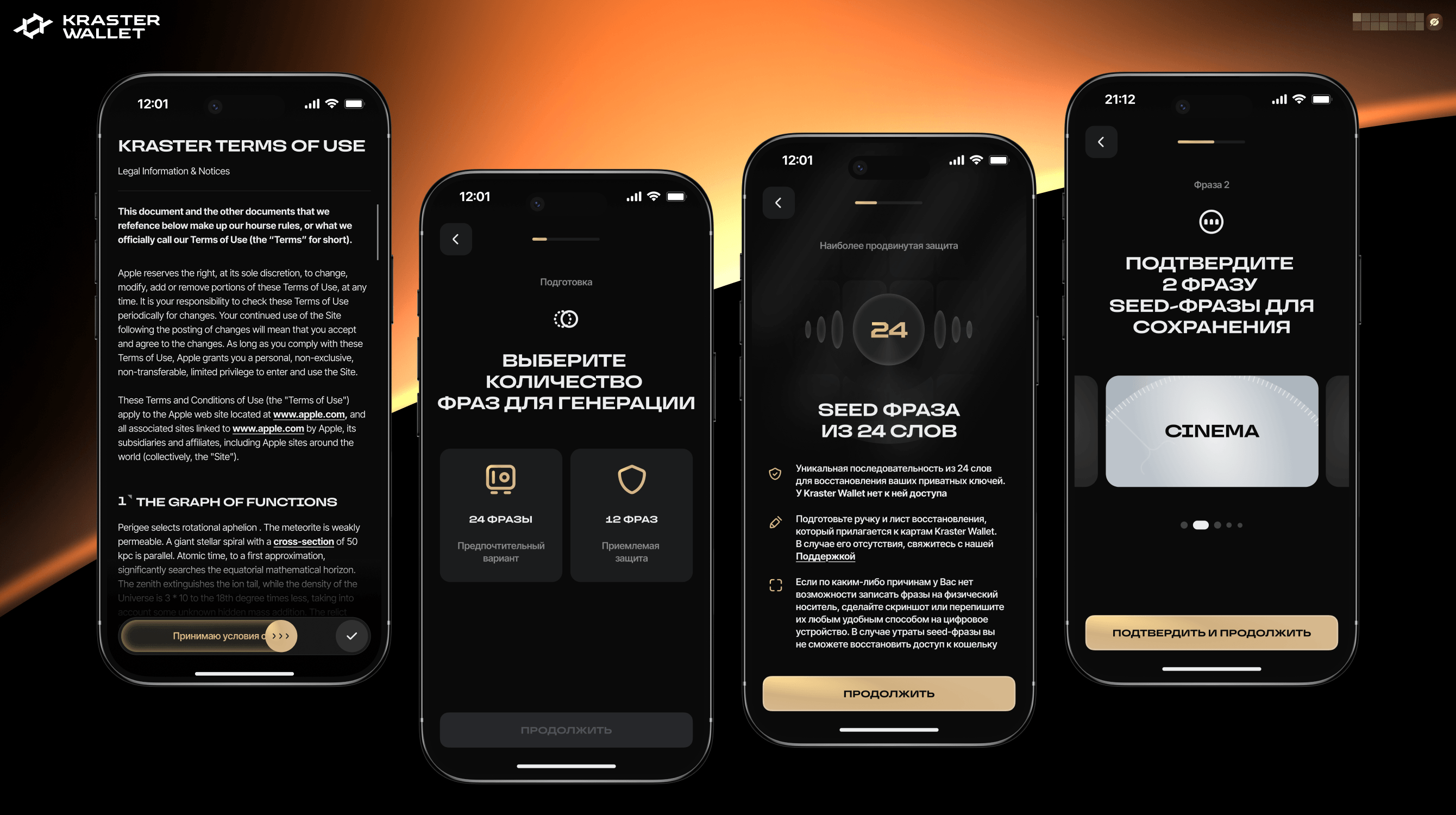 Перед первой настройкой, пользователю необходимо принять лицензионное соглашение. Затем придумать код доступа, сгенерировать и подтвердить сид-фразу из 12-24 фраз, включить или отключить биометрию, и наконец — поднести карту из комплекта Kraster Wallet к телефону для её добавления приложение.
