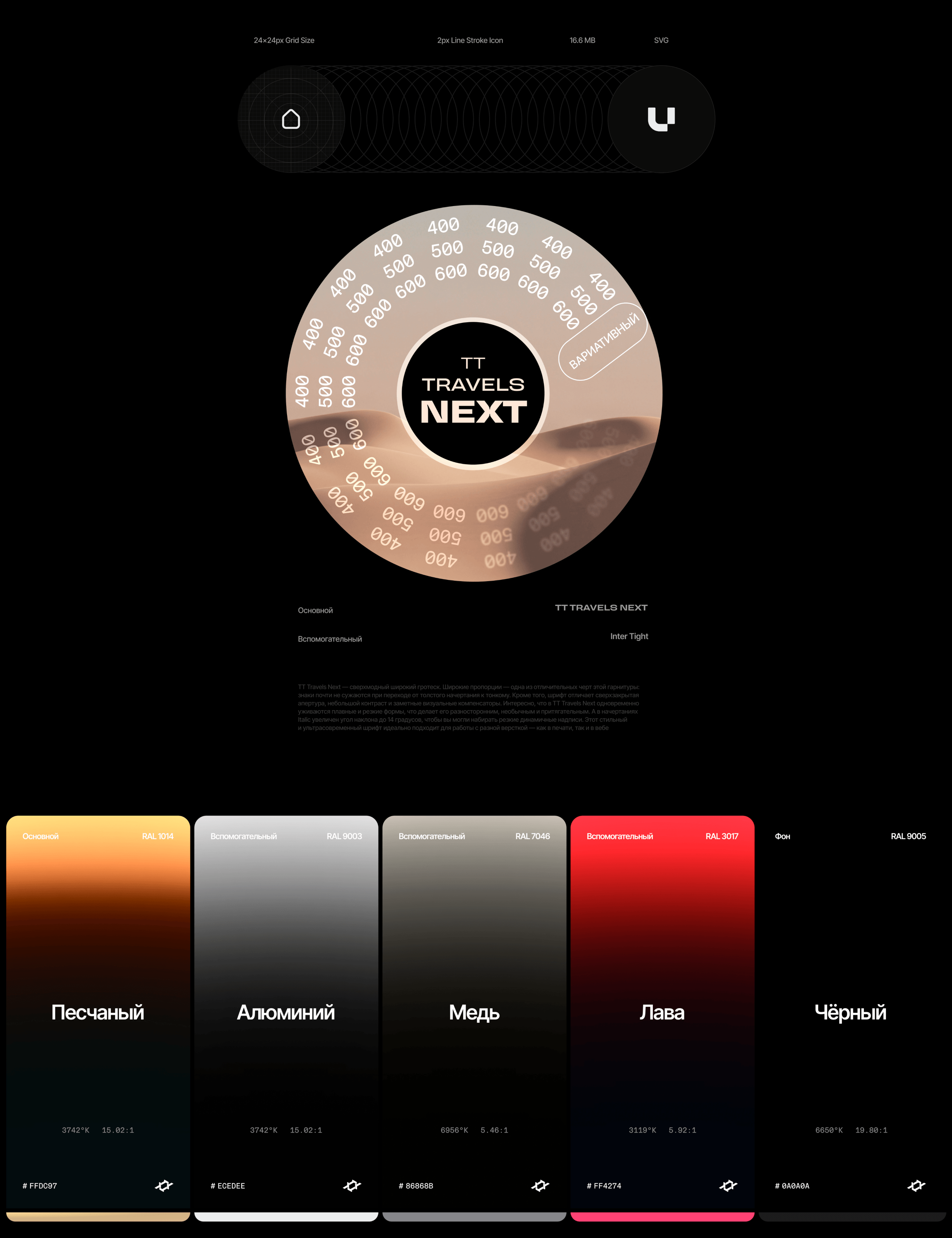 TT Travels Next — гротеск с широкими пропорциями — одна из отличительных черт этой гарнитуры: знаки почти не сужаются при переходе от толстого начертания к тонкому. Кроме того, шрифт отличает сверхзакрытая апертура, небольшой контраст и заметные визуальные компенсаторы. Интересно, что в TT Travels Next одновременно уживаются плавные и резкие формы, что делает его разносторонним, необычным и притягательным. Этот шрифт идеально подходит для работы с разной версткой — как в печати, так и в вебе.