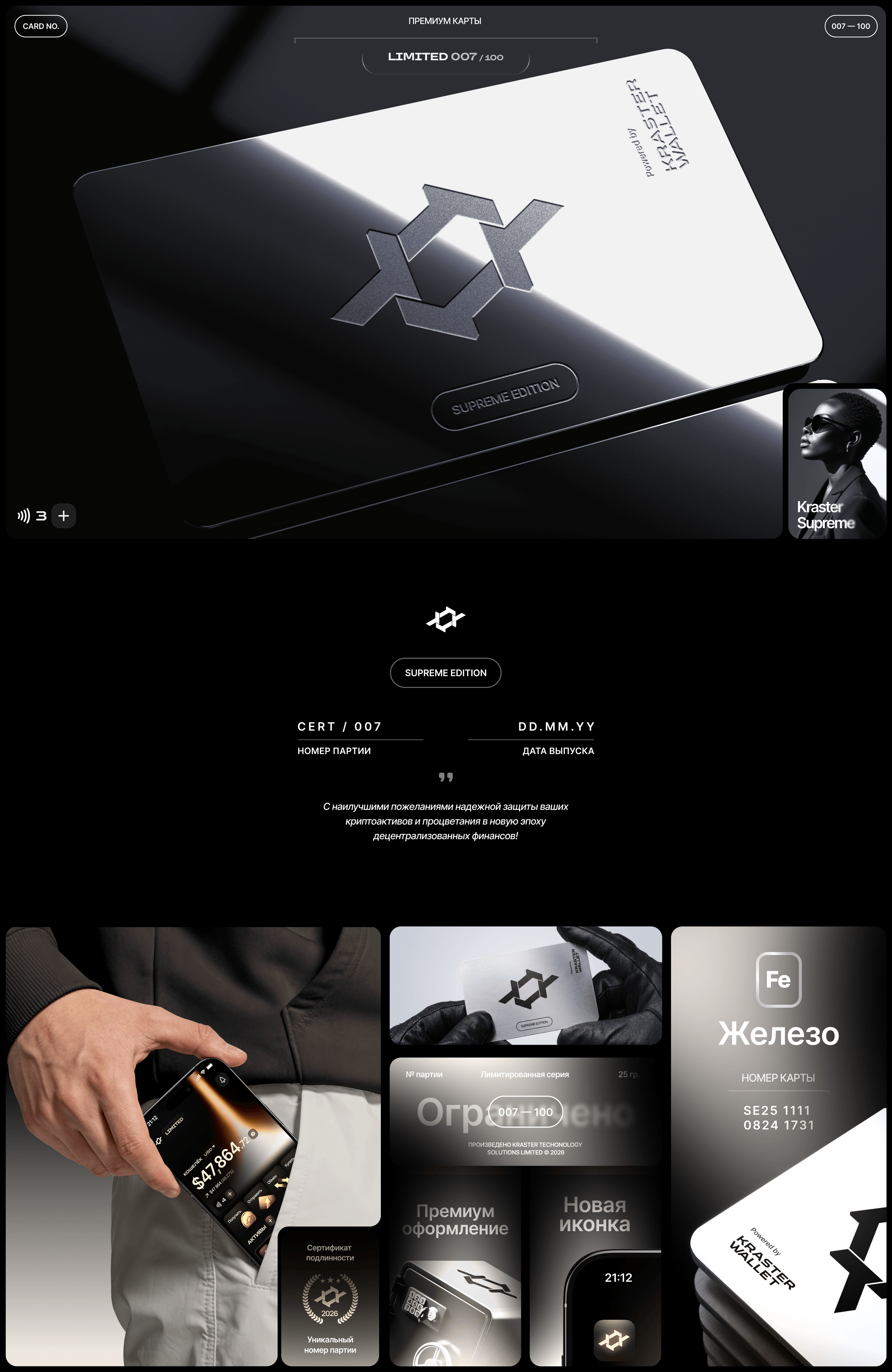 Лимитированная версия карт Kraster Wallet выпущенная в ограниченном тираже до 100 штук. Карты Supreme выполнены из дорогих материалов и имеют высокую коллекционную ценность.