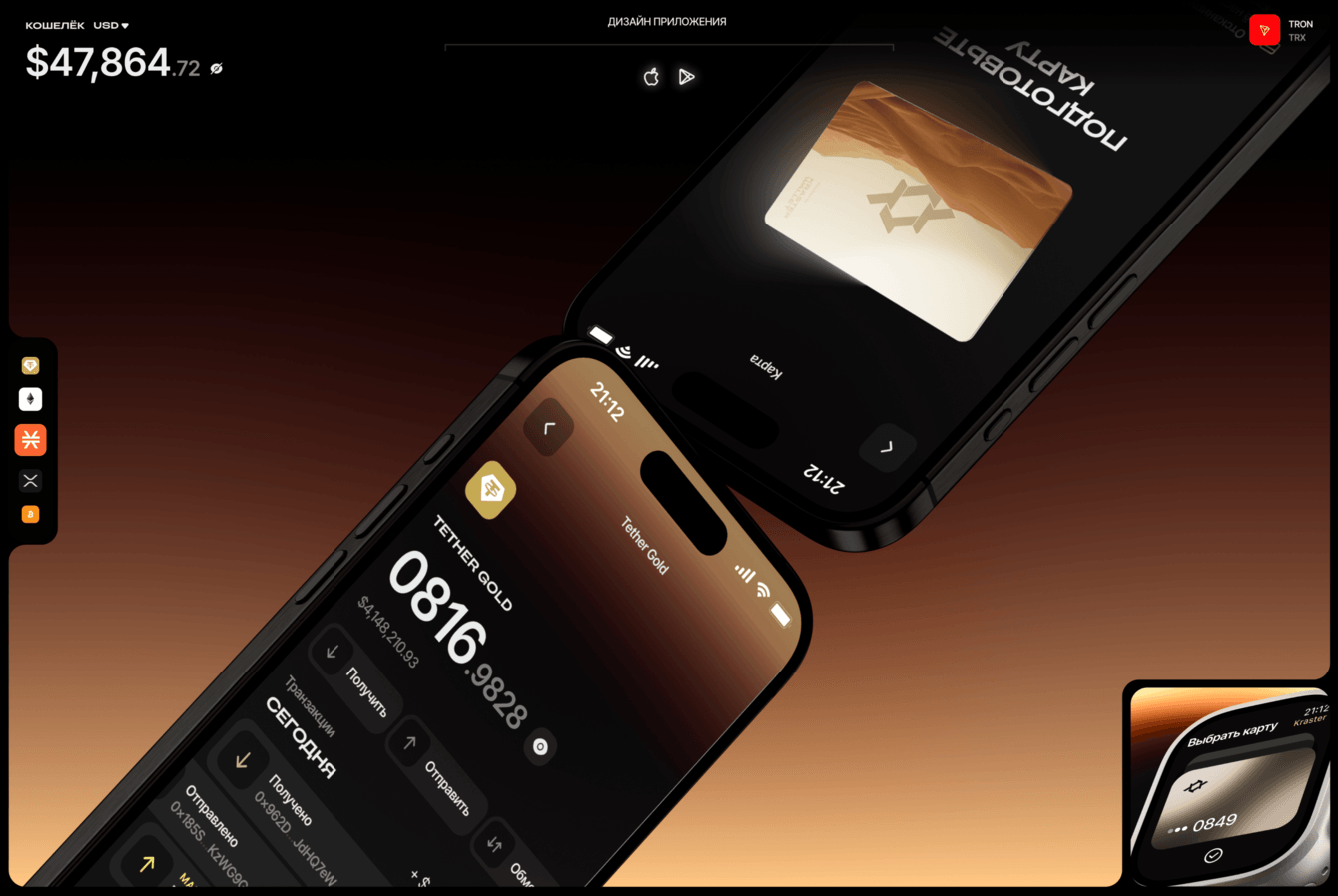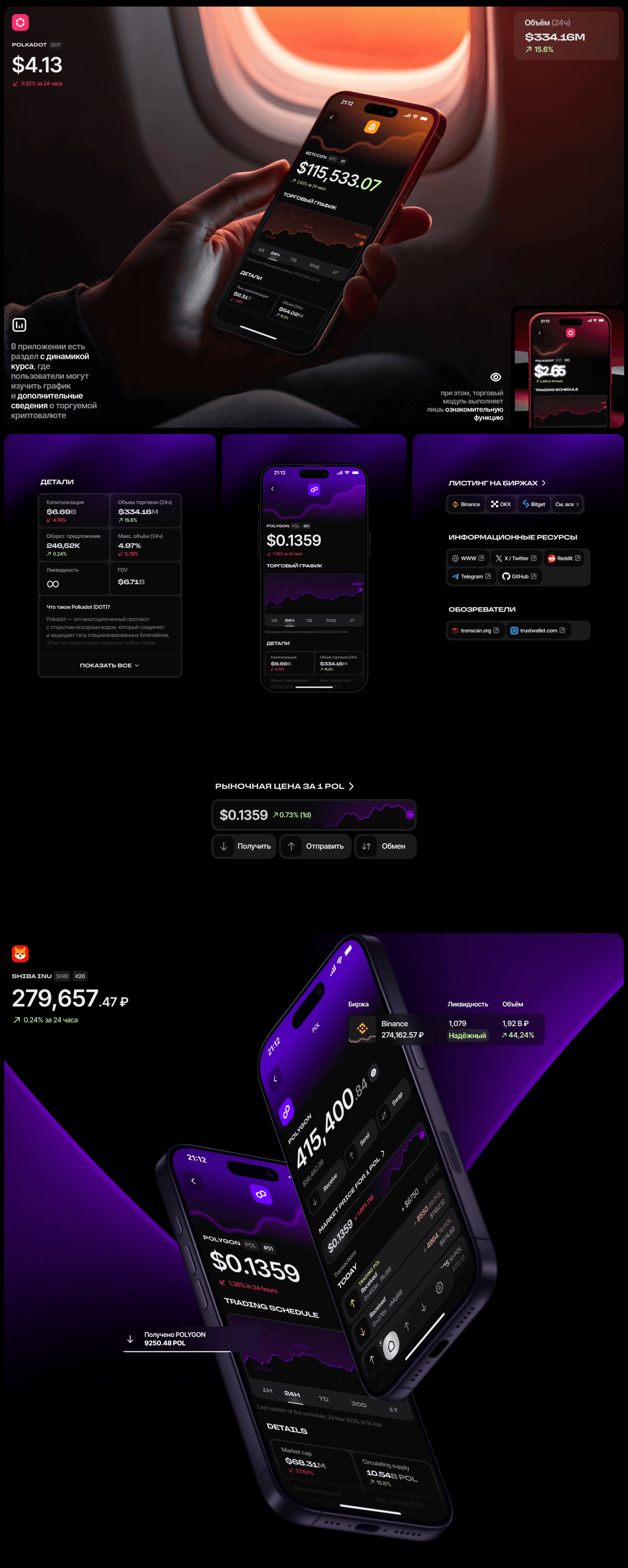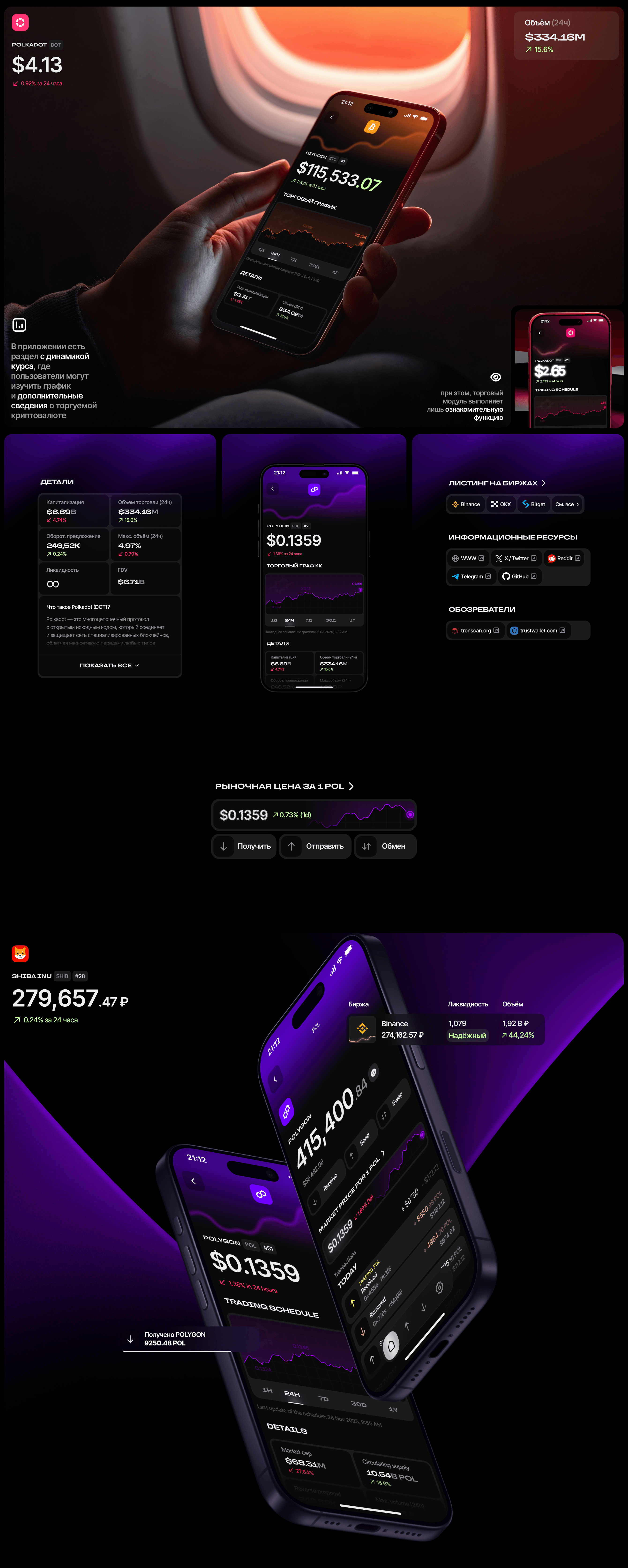 Лендинг балансирует между рендерами аппаратной части и чистым, минималистичным интерфейсом приложения. Темная тема с акцентными неоновыми или градиентными элементами отлично подчеркивает эстетику блокчейна.