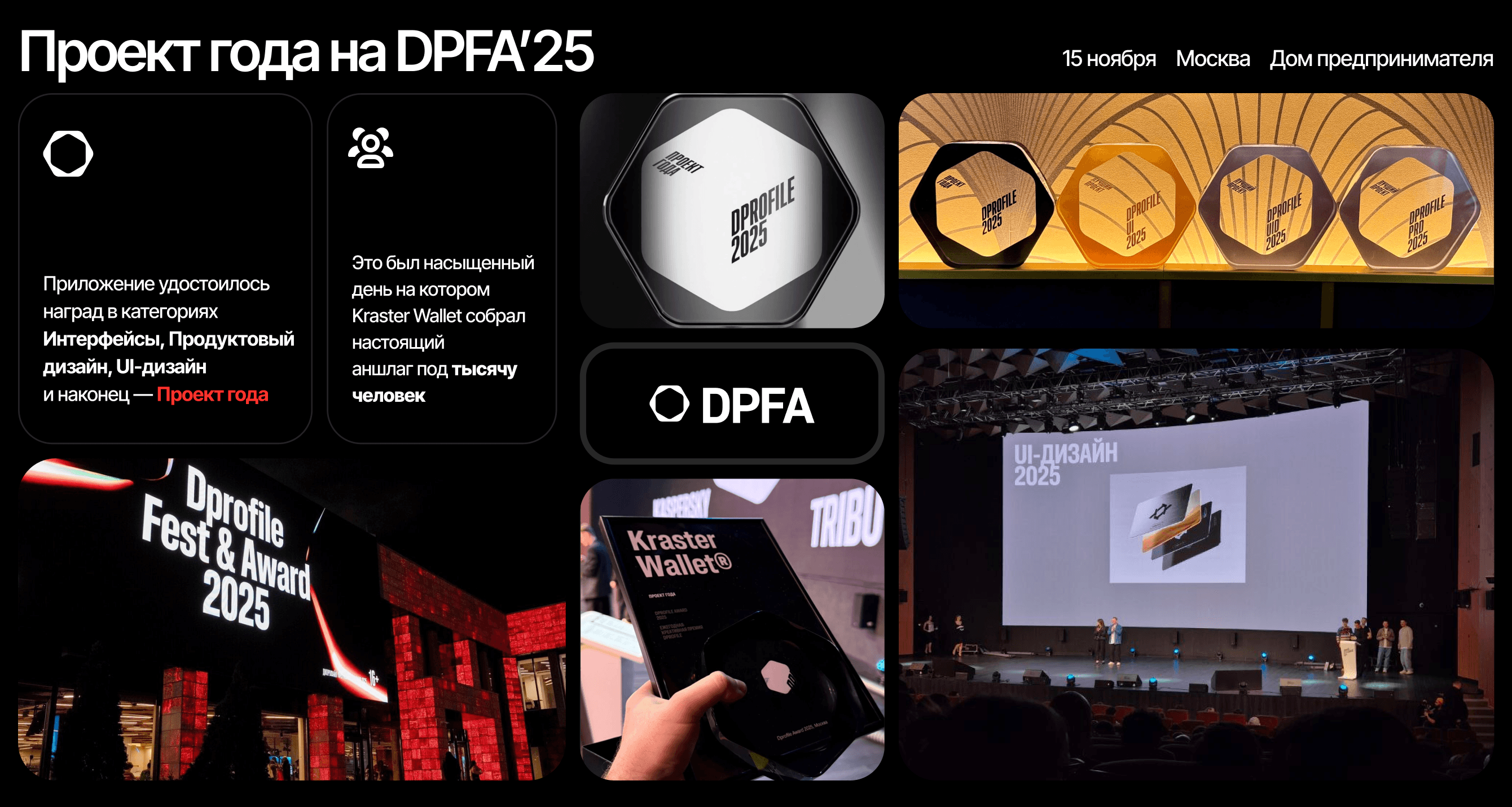 В ноябре 2025 в Москве состоялась премия DPFA 2025. На главной сцене Kraster Wallet собрал триумф и стал обсуждаемым номинантом того вечера, взяв статуэтки лучшего проекта в категориях «Интерфейсы», «Продуктовый дизайн», «UI-дизайн» и наконец — Проект года.