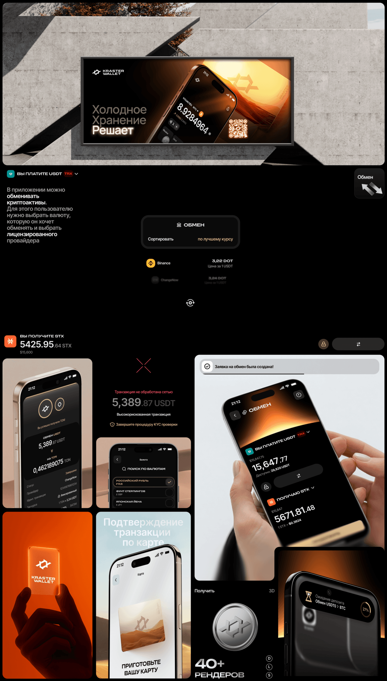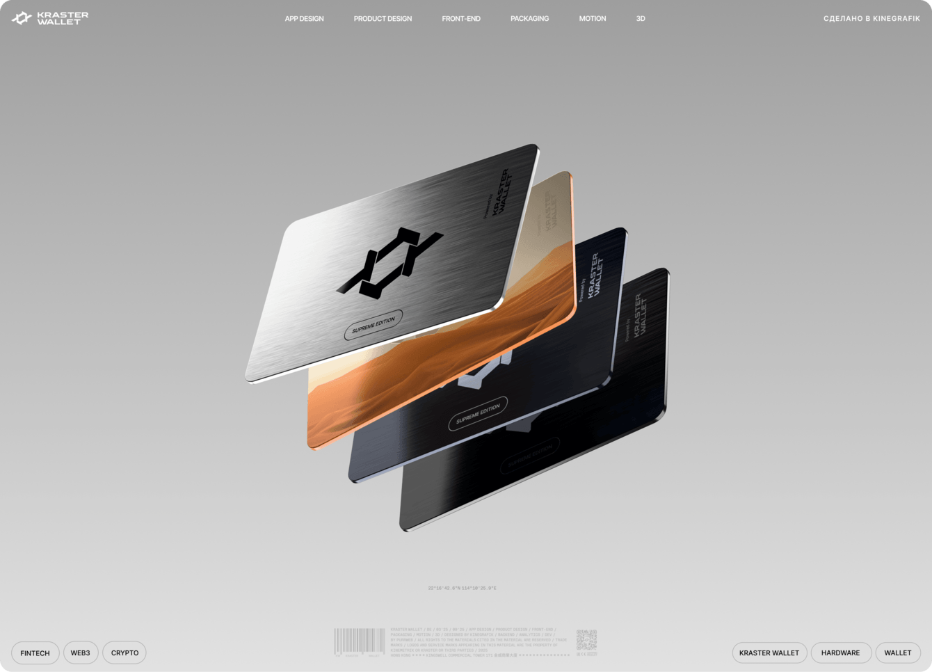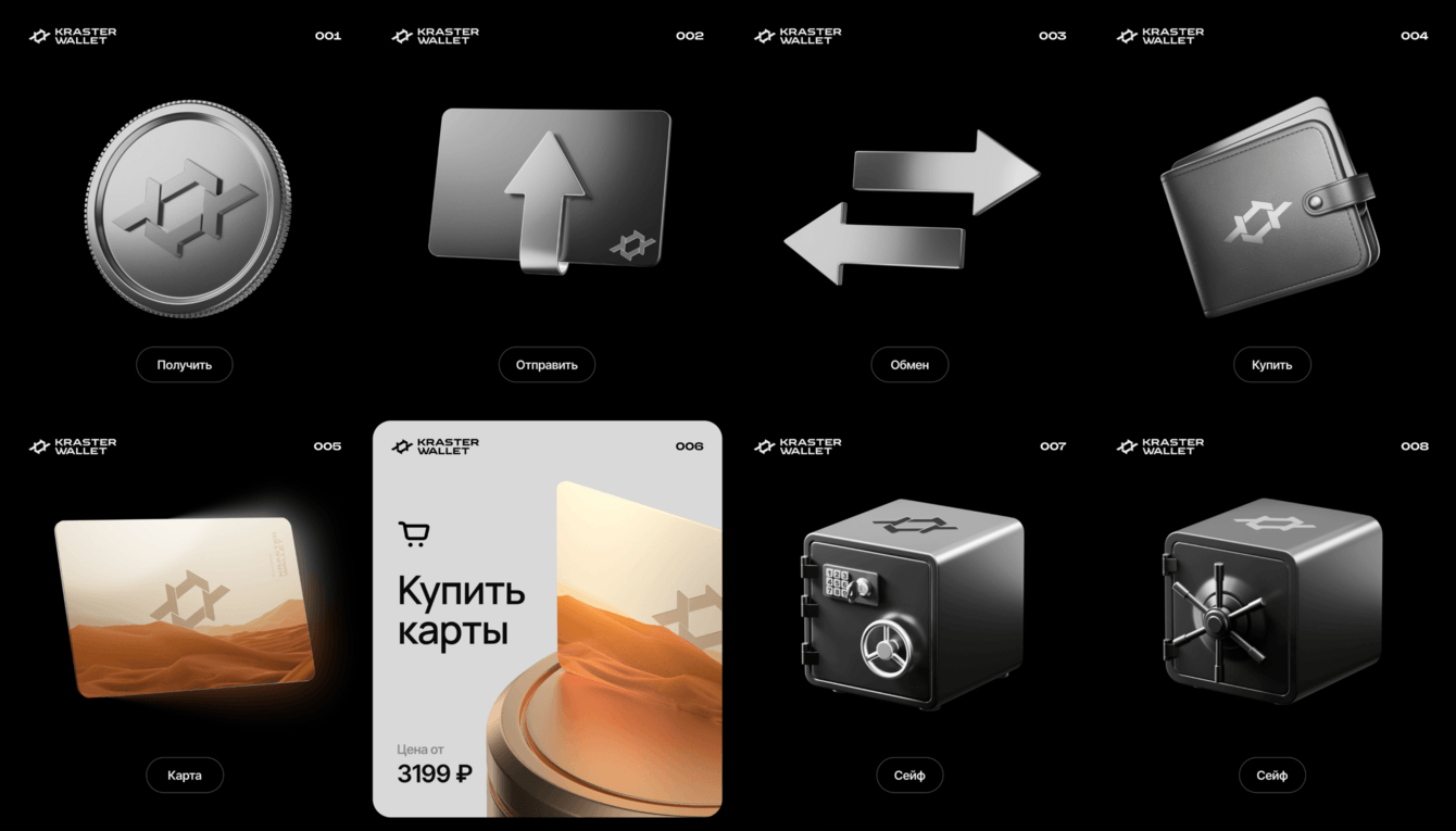 Для бренда Kraster Wallet мы разработали фирменный комплект с 3D рендерами. Графика охватывает как приложение, так и платформу Kraster. Wallet Кроме этого был разработан шоурил, демонстрирующий работу приложения с использованием криптокарт.