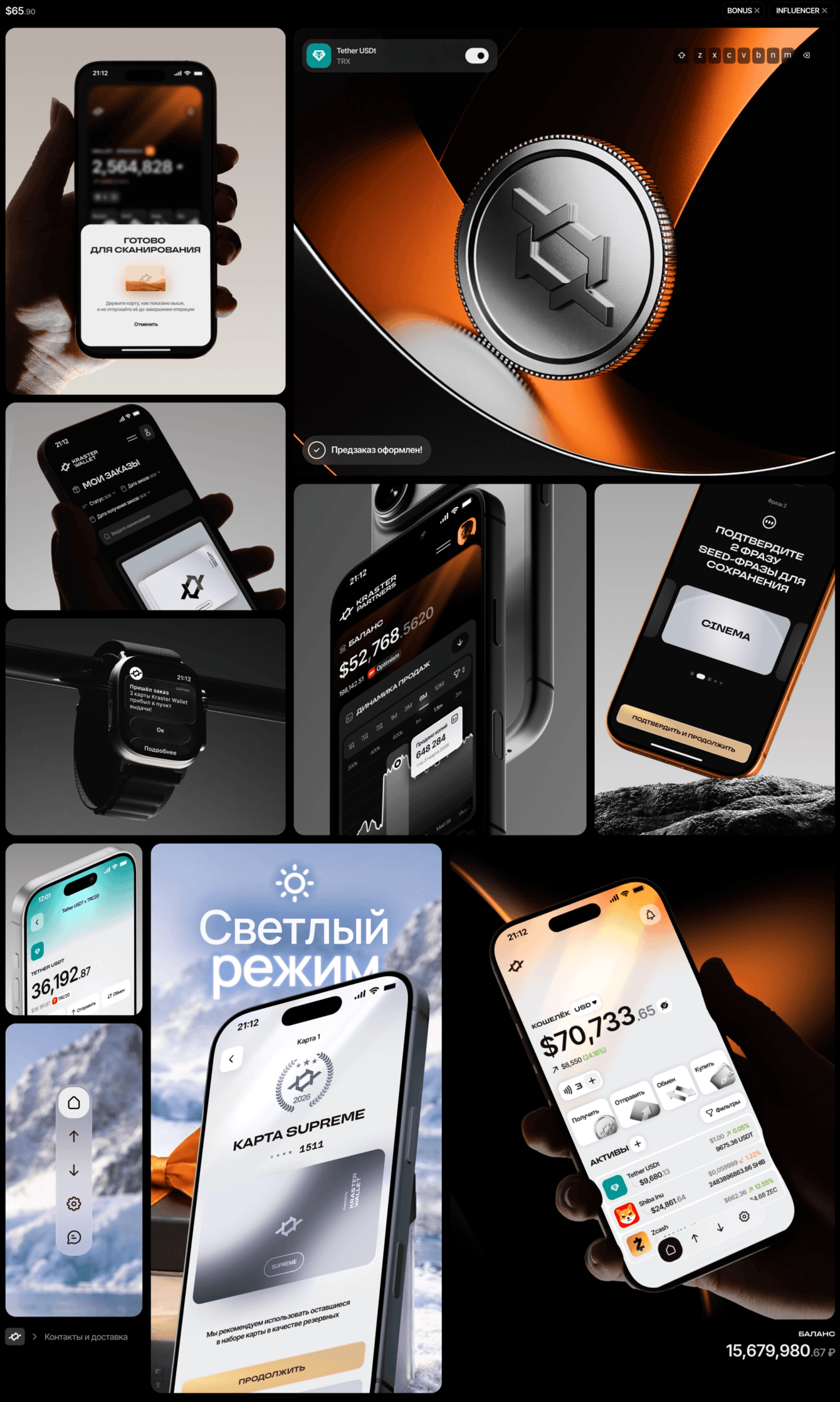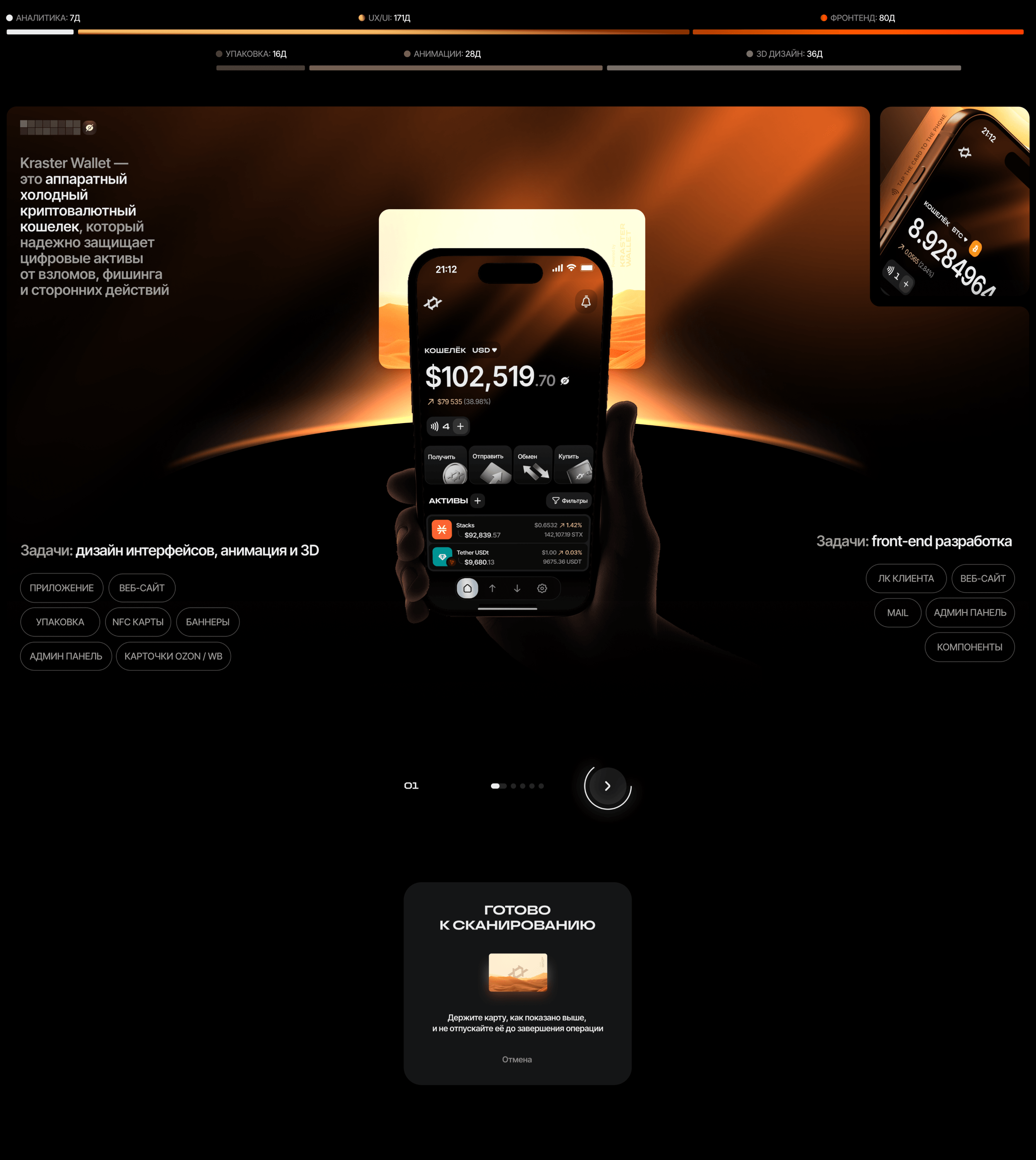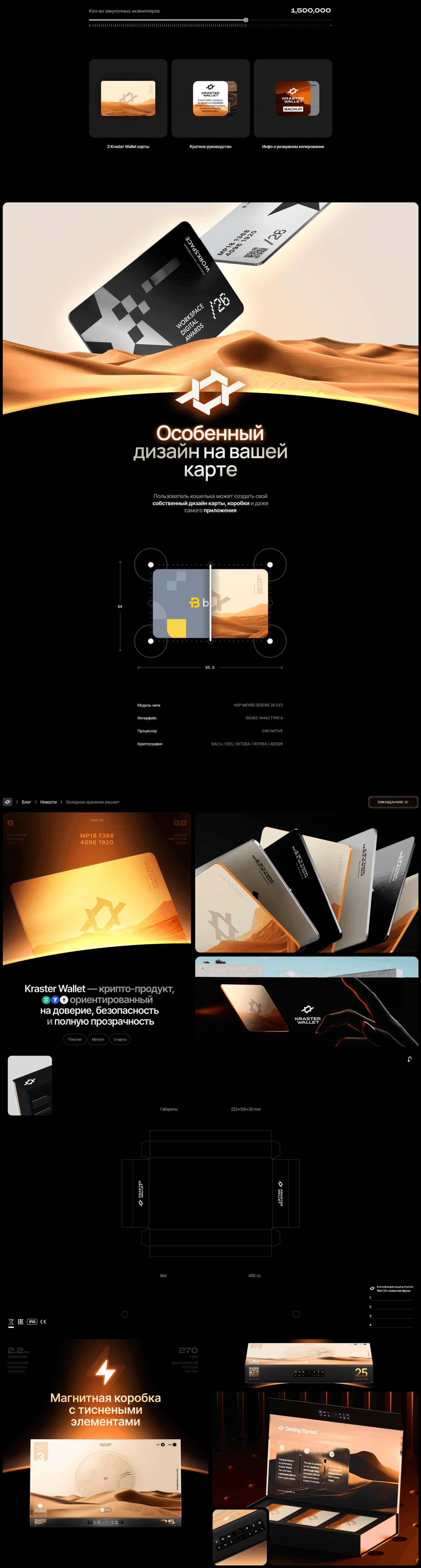 Для бренда Kraster Wallet мы разработали фирменный комплект с 3D рендерами. Графика охватывает как приложение, так и платформу Kraster. Wallet Кроме этого был разработан шоурил, демонстрирующий работу приложения с использованием криптокарт.