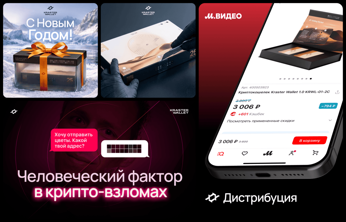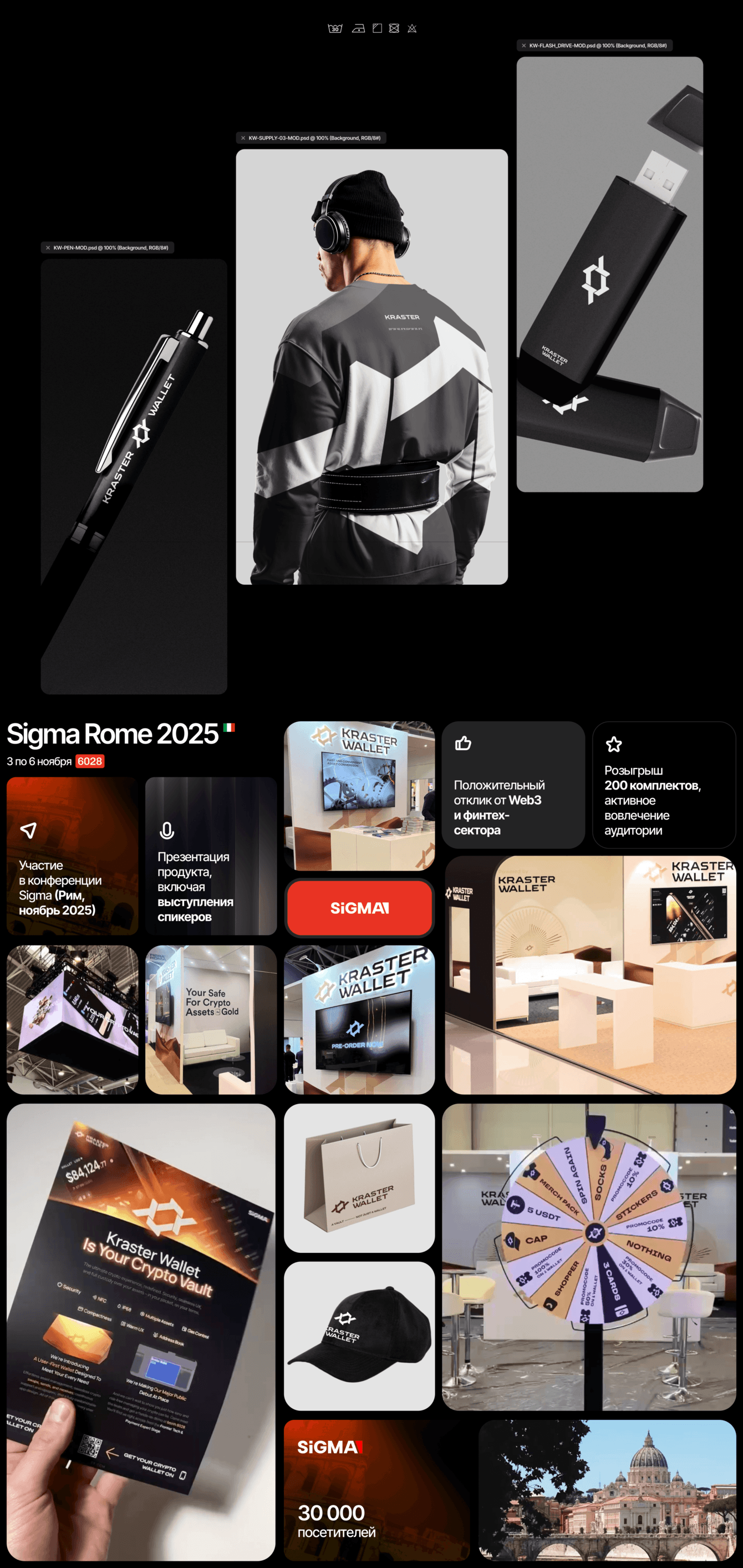 Совместно с маркетологами были созданы десятки креативов для публикации в соцсетях, а ещё мы поучаствовали в создании мерча марки Kraster Wallet который быстро был разобран на ноябрьской конференции в Риме.