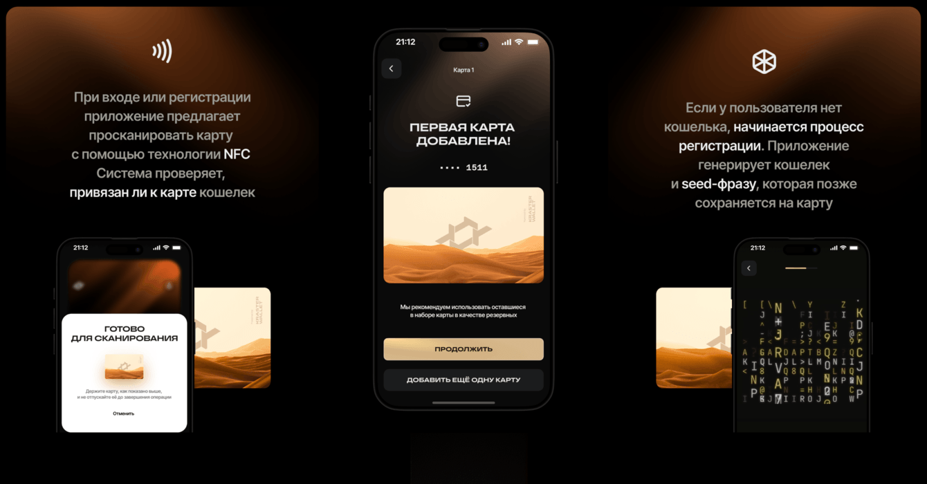 Продукт выделяется наличием ключа доступа в физическом формате. NFC-карта повышает уровень защиты и удобство пользования — доступ к кошельку возможен только через карту, а пользователи могут управлять своими активами без ручного ввода кода безопасности. В приложении также есть дополнительная проверка по PIN-коду и биометрии.
