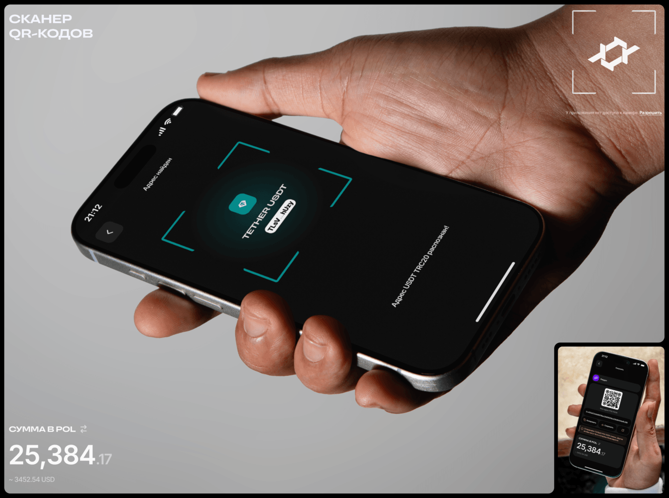 Предусмотрен встроенный сканер для считывания QR-кодов токенов. Это позволяет быстро переводить криптовалюту, не вводя длинные адреса вручную и исключая риск опечатки.
