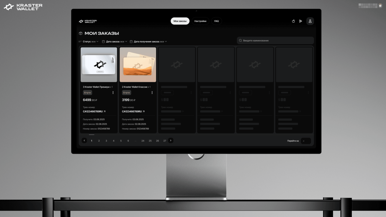 Ключевой модуль клиентской платформы. Здесь пользователь может узнать подробную информацию о каждом заказе с фильтрацией по статусам, датам и с возможностью поиска по наименованию.