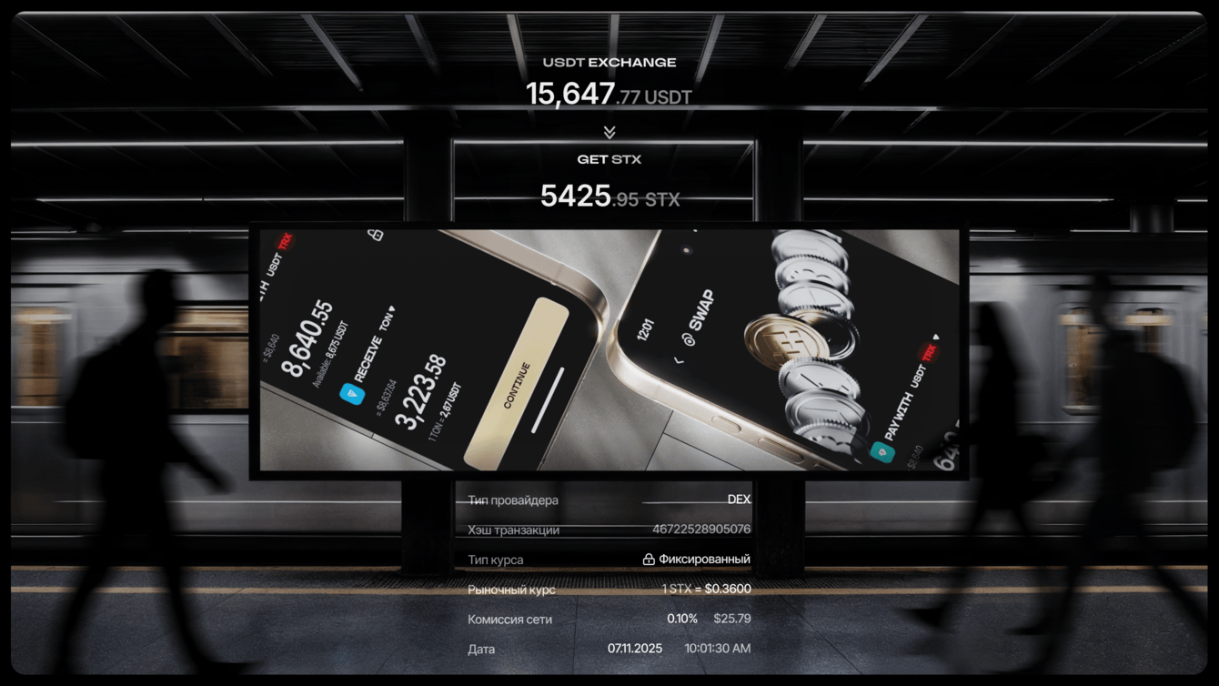 Дополняет основной функционал, обмен криптоактивов с выбором сети и провайдера из лицензированного списка FCA и типа курса (фиксированный или плавающий) с последующими экранами статуса транзакции в конвертируемой валюте.