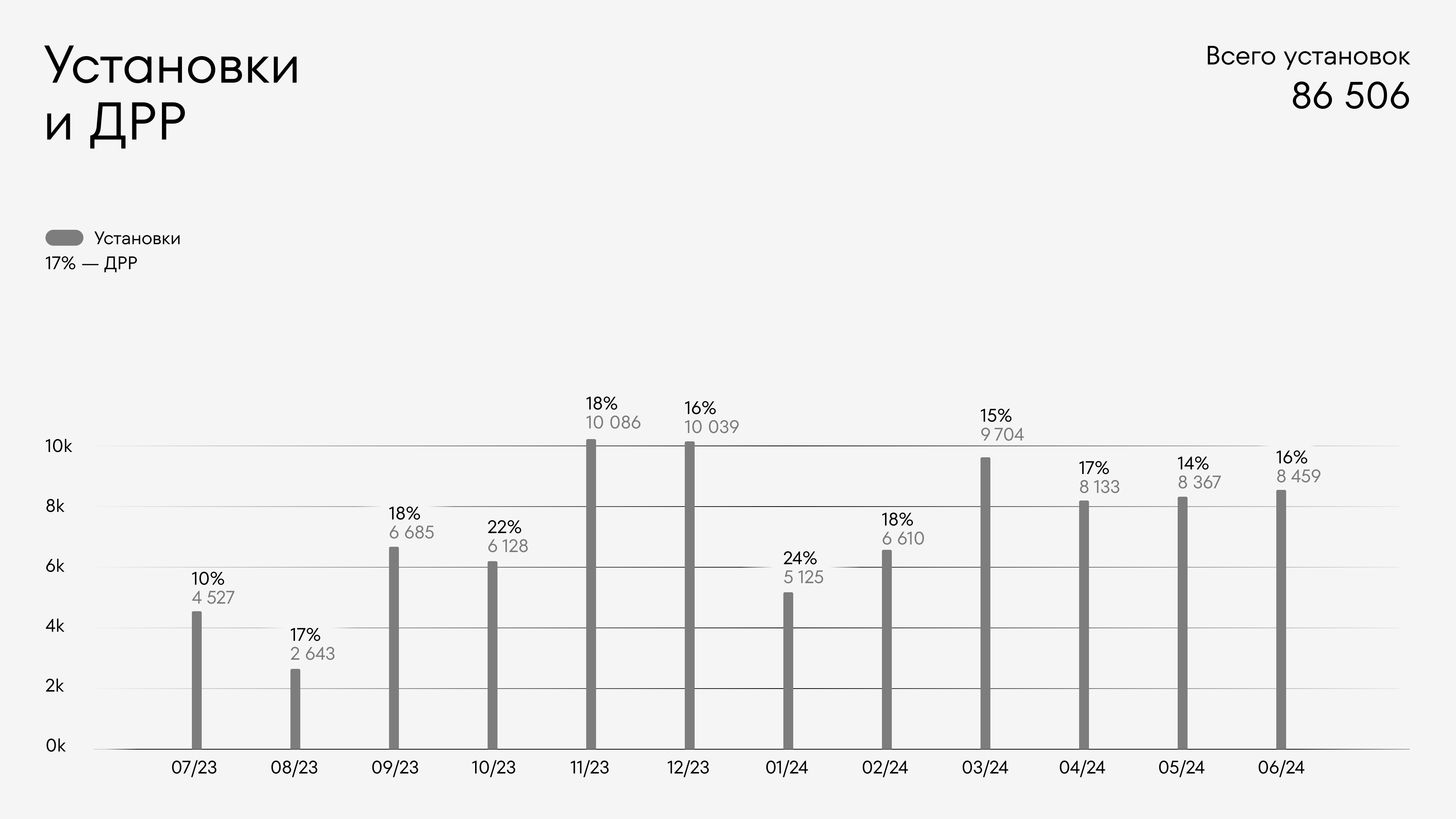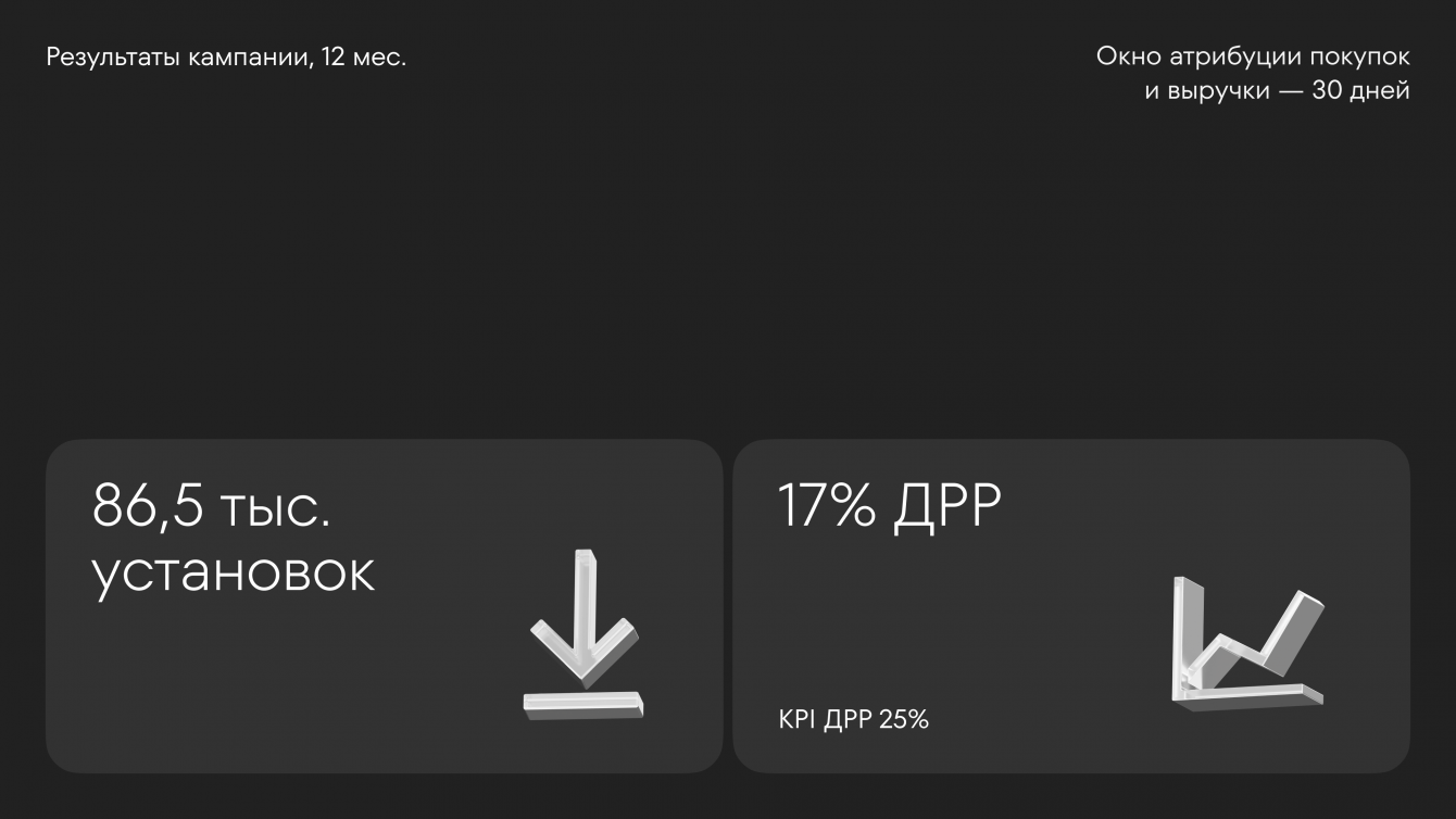 В течение 12 месяцев мы равномерно привлекали пользователей, тестируя товары и креативы, чтобы выявить и масштабировать лучшие с точки зрения окупаемости подходы. Мы не только усиливали сценарии креативов, которые показывали лучшие результаты, но и работали с анализом и оптимизацией аудитории.