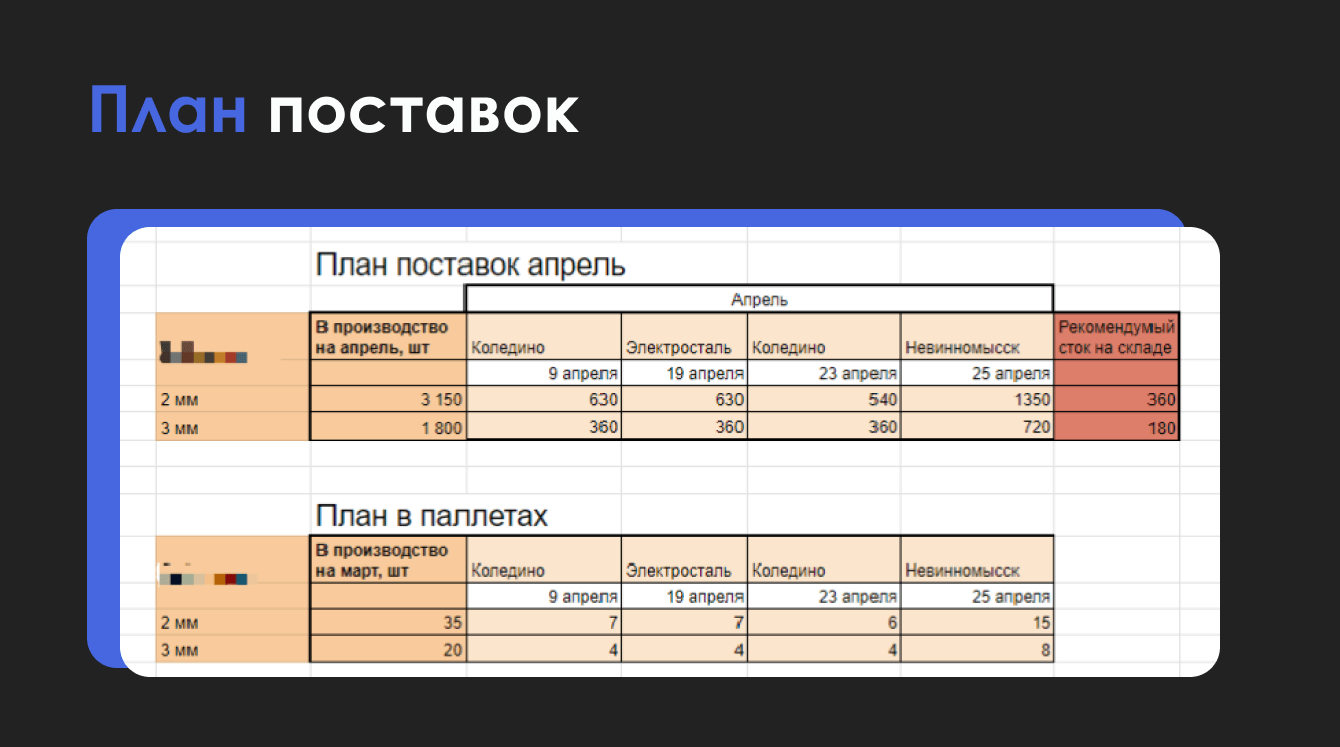 Когда мы вышли на стабильный уровень продаж, стало легче прогнозировать продажи и, соответственно, планировать поставки. Мы делали расчет в производство и планировали поставки по приоритетным складам: