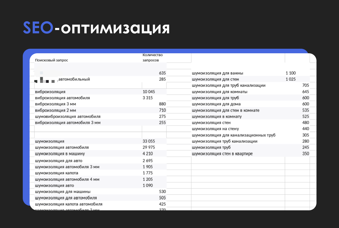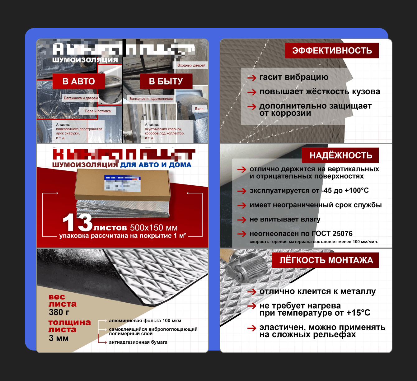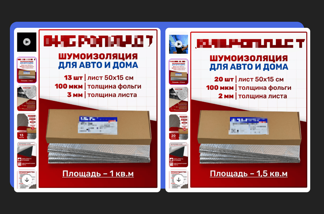 Мы проанализировали основных конкурентов рынка и выяснили, что максимальной популярностью у покупателя пользуются комплекты виброизоляции по 2 мм и 3 мм толщиной. Заказчик разработал для маркетплейса именно такие товары.