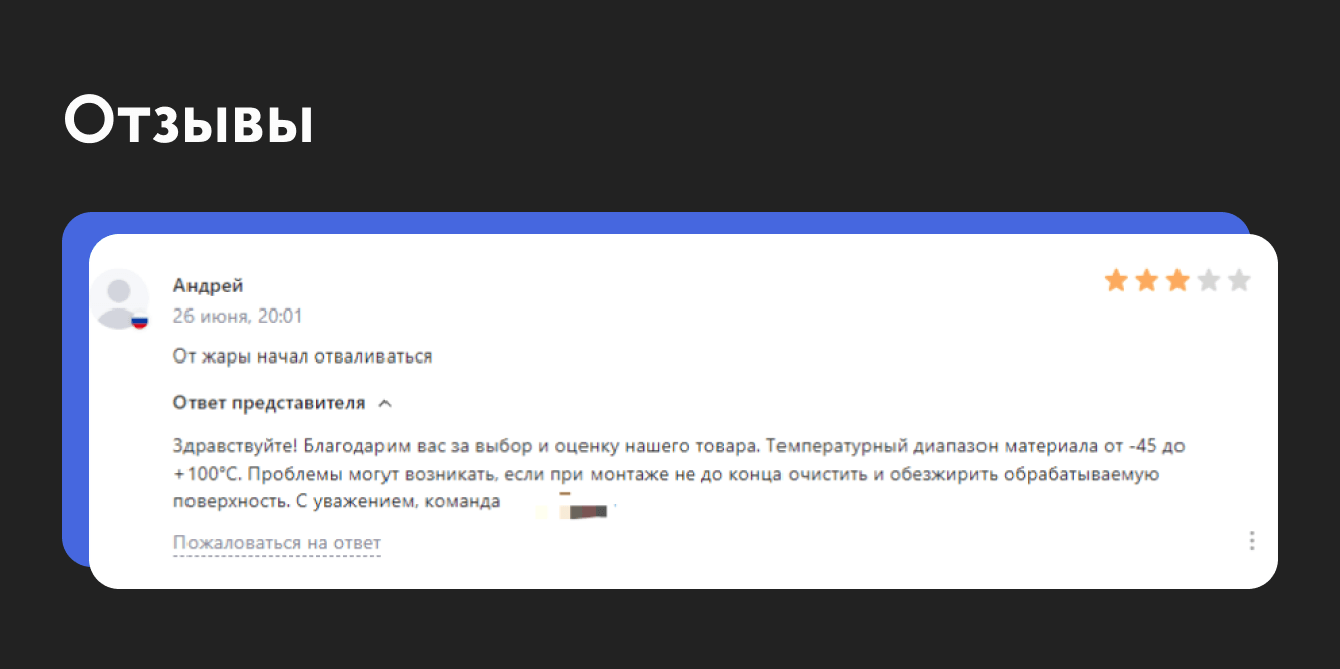 Аудитория проекта – постоянные покупатели, которые могут покупать товар неоднократно, поэтому важно качественно обработать отзыв, чтобы усилить лояльность к магазину и бренду. Кроме того, в ответах на отзывы мы старались рассказывать про преимущества и условия использования товара, ведь люди читают отзывы охотнее описания.