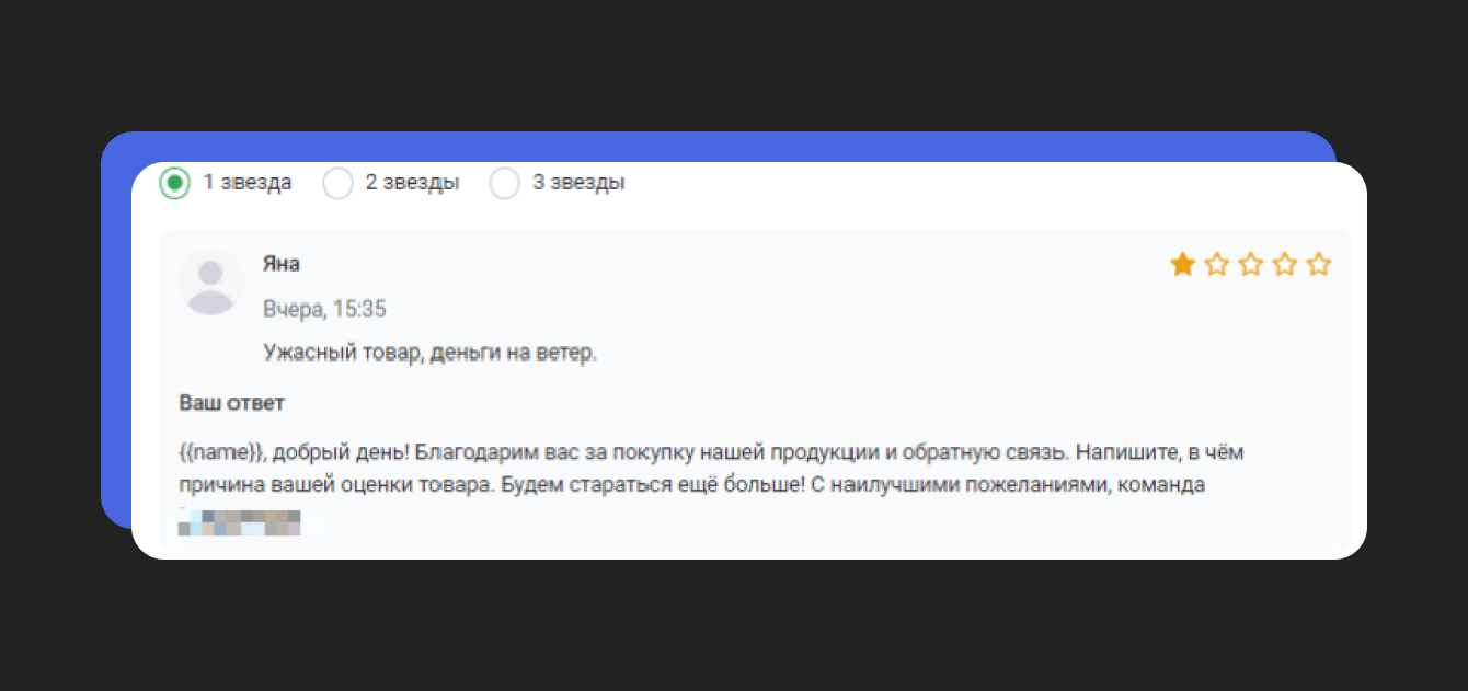 Для ускорения работы мы составили шаблоны для ответов на отзывы без текста и подключили автоответы: