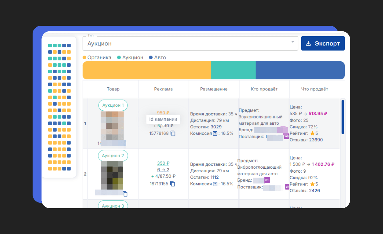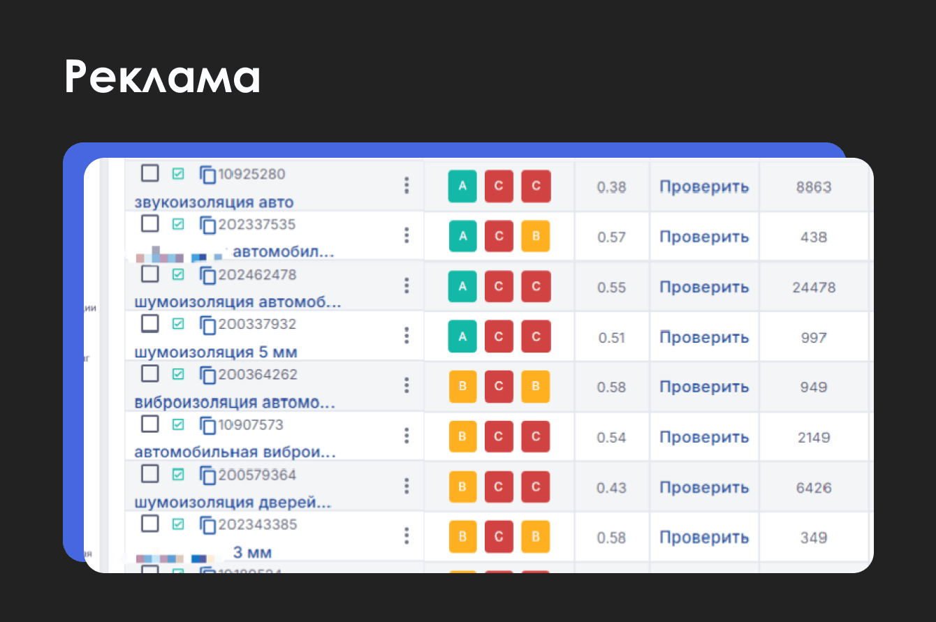 - удобно анализировали ставки конкурентов, их позиции и прочие показатели, чтобы лучше понимать ситуацию и делать свои настройки более эффективно: