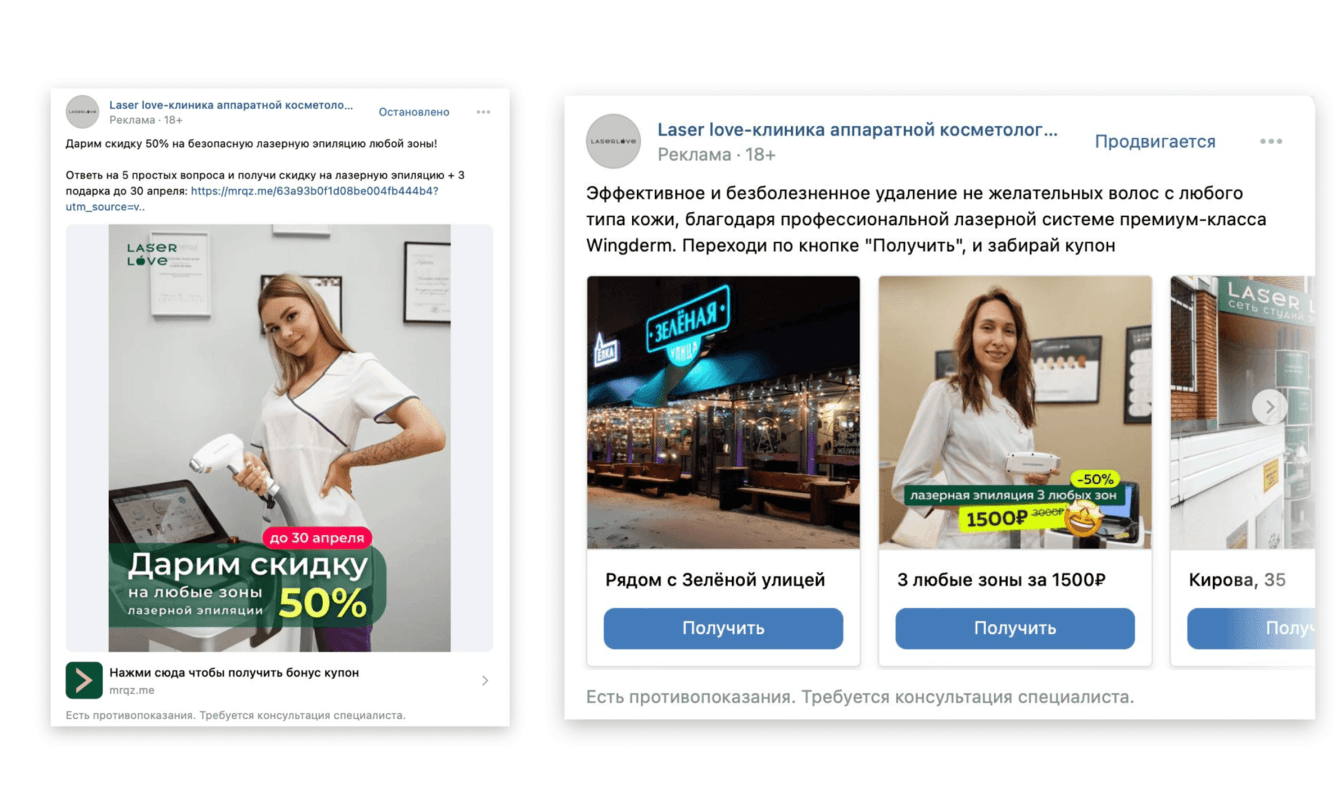 Вместе с квизом использовали купоны на услуги в качестве лид-магнита. Лучше всего себя показали объявления с каруселью — стоимость перехода в квиз была 227 рублей.