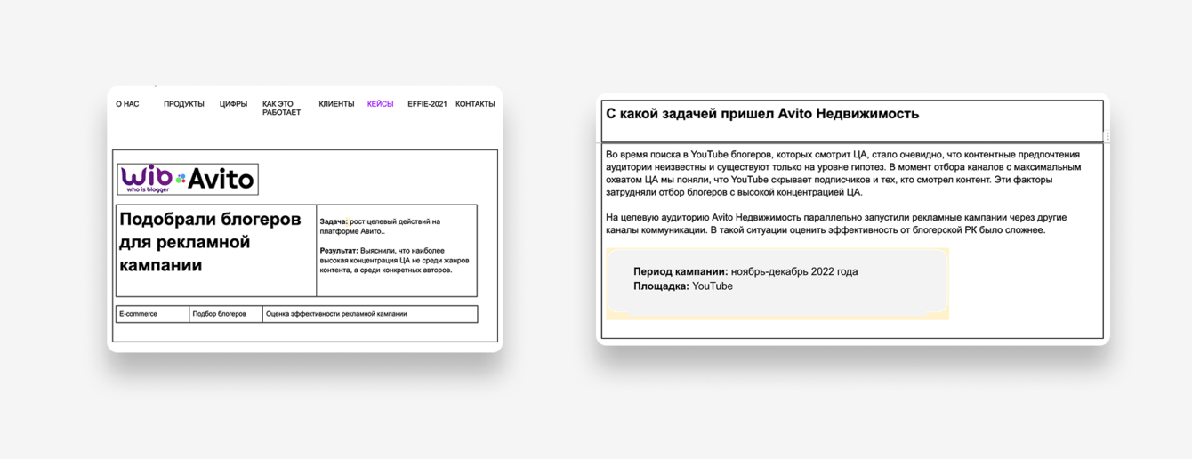 Общая логика следующая: посетитель попадает в раздел с кейсами, листает и первым делом видит большой баннер с новым кейсом. Дальше можно с помощью фильтров выбрать интересующий продукт WhoIsBlogger и сферу.