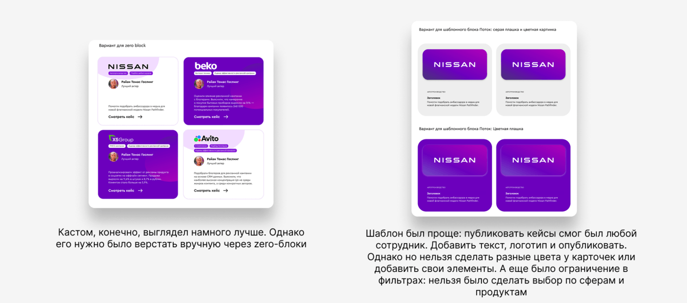 Шаблонный подход оказался проще, но ограничивал в кастомизации карточек и количестве фильтров.