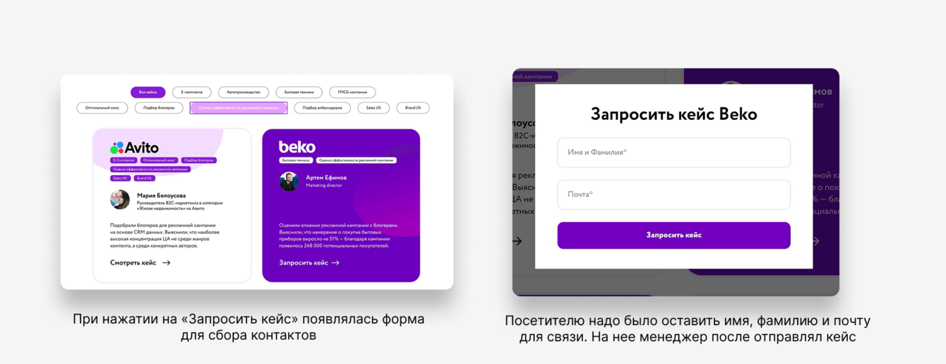 Во время верстки добавили карточки кейсов с кнопкой «Запросить кейс», которые переводят на форму сбора контактов. После менеджер уже связывается с потенциальным клиентом и высылает презентацию по кейсу. Так у нас получилось сделать страницу более наполненной на старте и сделать дополнительный лид-магнит.