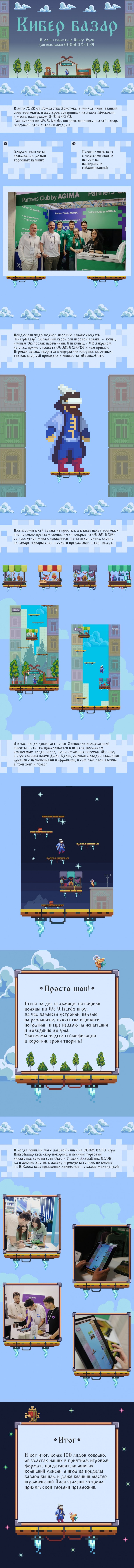— Создали дизайн-концепцию в стиле выставки, куда ехали с этой игрой: главный герой – купец в VR-очках с афиши ECOM EXPO`24, мы назвали его Экспослав. Стилистика игры – Кибер-Русь: на фоне цветные избушки-высотки, так как выставка проходила на территории Москва-Сити. А в качестве платформ, от которых отталкивается Экспослав, выступают торговые палатки, ведь на выставке происходит то же самое – представители компаний приезжают со всего света и, стоя у стендов, предлагают свои товары и услуги.