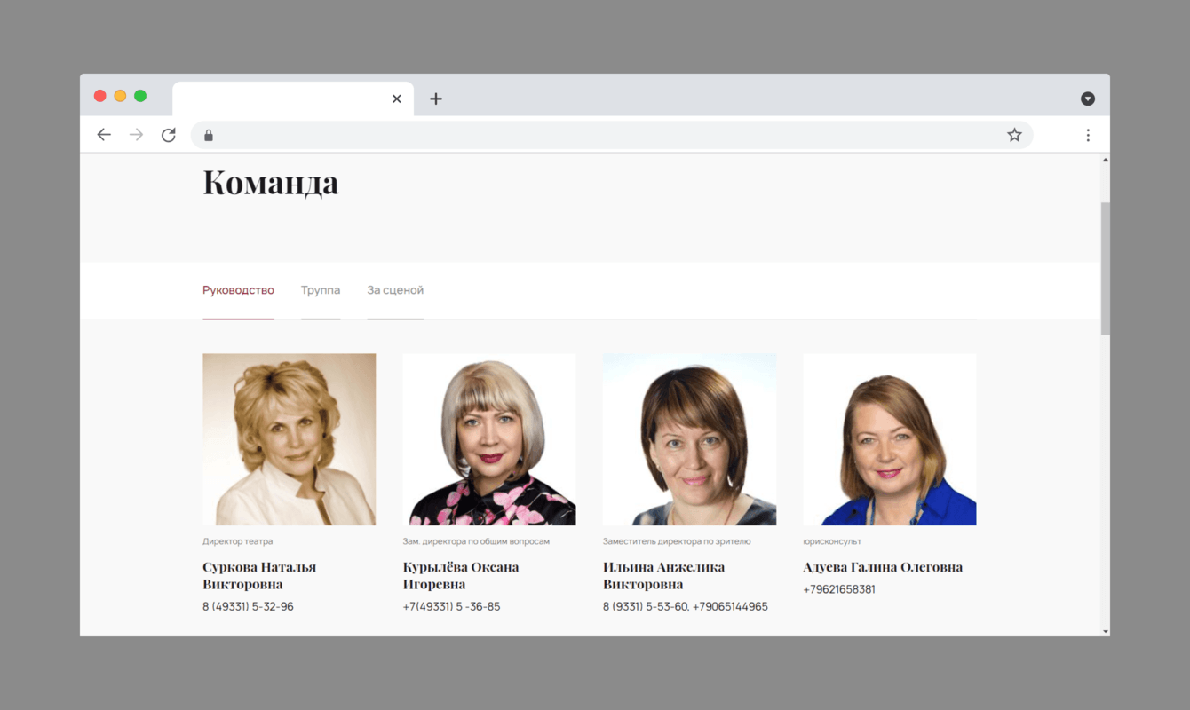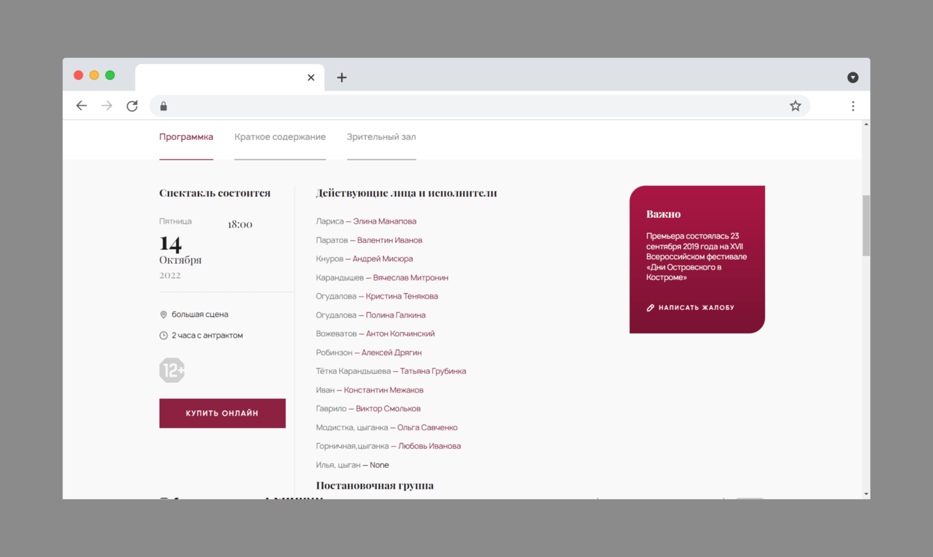 Мы сделали четкое разделение информации в отдельных блоках меню - предусмотрели возможность отдельного добавления афиши, новостей, информации о театре, сведения о режиме работы и т.д. В главном блоке расположили иллюстративный ряд и сведения о премьерах и спектаклях с функцией перелистывания, а также навигационную панель, ведущую во все разделы сайта. В разделе Афиша - актуальная информация обо всех премьерах и спектаклях, сведения о дате ближайшего спектакля, наличии свободных мест и стоимости каждого билета. Актуальные события, анонсы мероприятий, информация об изменениях в работе и т.д. - в разделе новости. Анонс к каждой новости публикуется на главной странице в виде изображения и краткого описания. При клике на любую новость пользователь попадает на отдельную страницу и может скопировать ссылку. В разделе «Посетителям» пользователь найдет всю информацию о правилах посещения театра, правилах поведения в зале, а также о проекте «Театр для многодетных семей». В подразделе «Гостевая книга» можно оставить отзыв на любой спектакль из репертуара театра.
