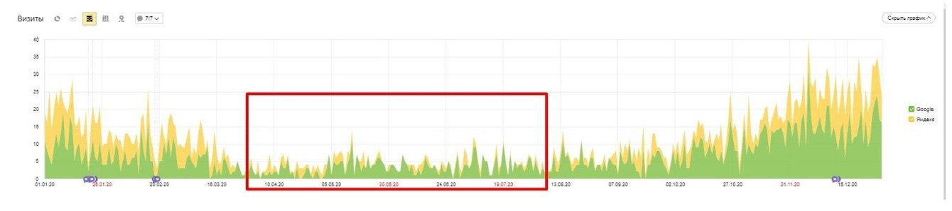 1. Вот какие данные показывает трафик за 2020 год. Мы видим, что с апреля по август идет снижение посещаемости. Посещаемость начинает расти с сентября, когда жара начинает спадать: