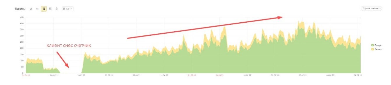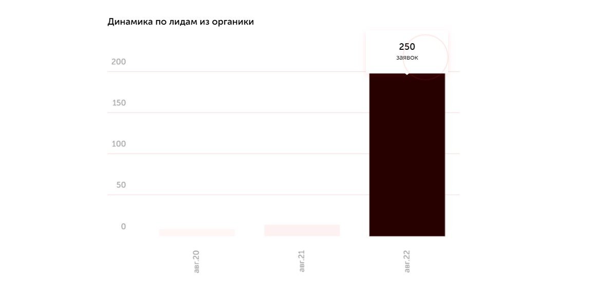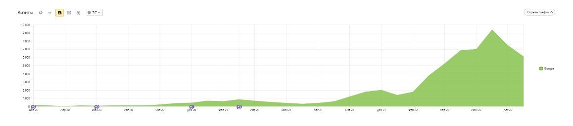 2022 год не похож на предыдущие: в сентябре 2021 был разработан новый сайт, также на Tilda. Однако на нем учтены все наши пожелания по отношению к продвижению. И вот что мы видим на графике: