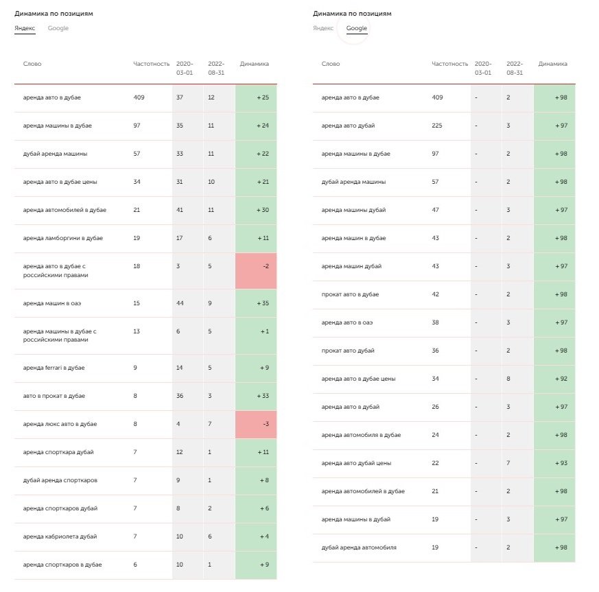 В таблицах показаны запросы выборочно. Показать их все на одной странице кейса проблематично :) Однако даже по выборке можно увидеть положительную динамику. Особенно в Google, настолько желанном для нашего партнера.