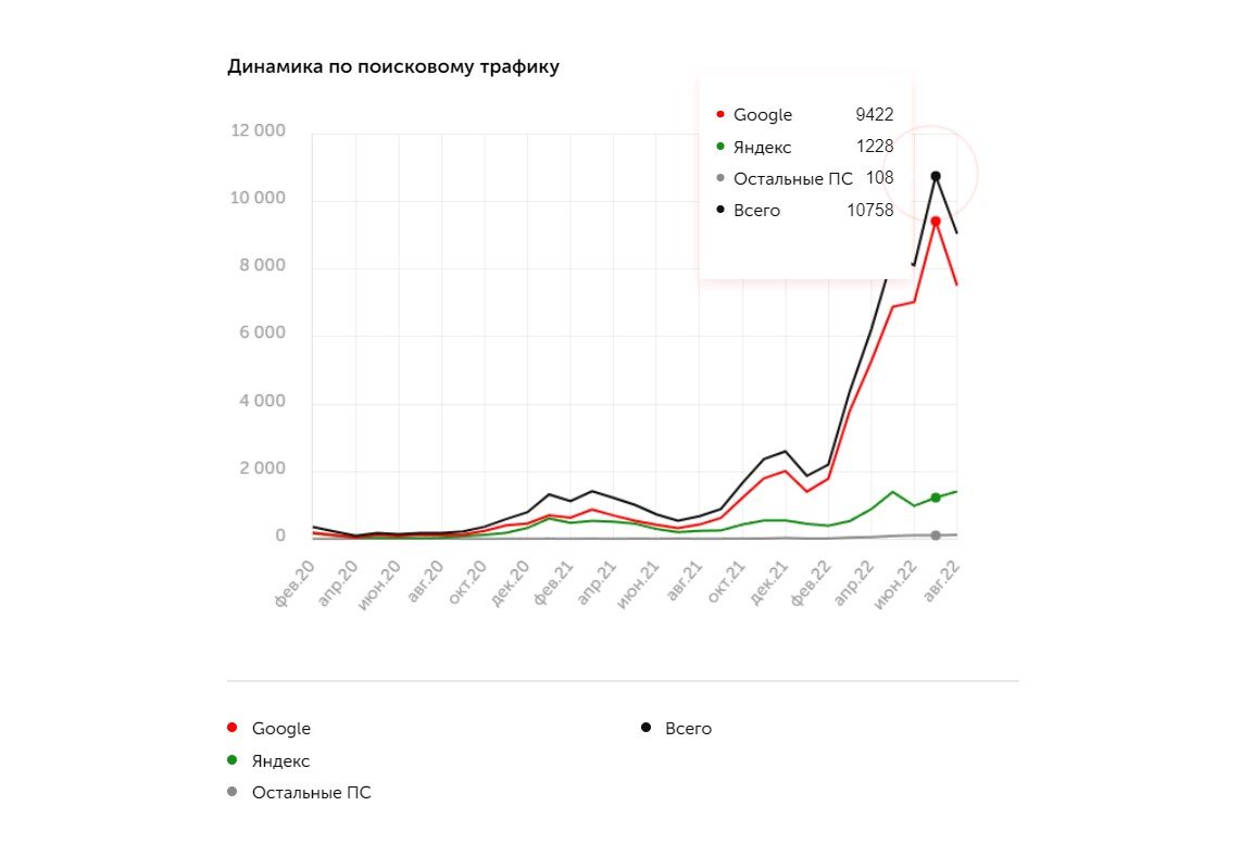 Здесь кривые графика говорят за себя. Акцентируем еще раз внимание на том, что лето - не сезон для ОАЭ, но трафик в 2022 году просто игнорирует этот факт :) Ежемесячный поисковый трафик с февраля 2020 по август 2022 вырос в 25 раз.