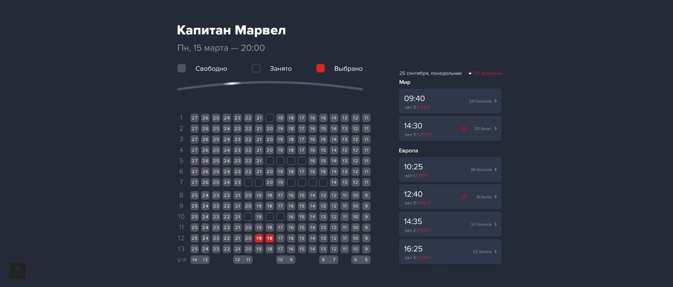 Расписание сеансов можно просматривать как по кинотеатрам, так и по времени показа независимо от кинотеатра. Здесь же показано количество свободных мест в зале, цена билета и формат фильма.