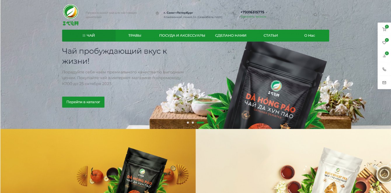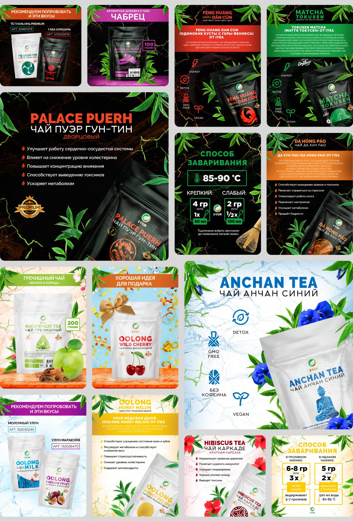 Разработаны более 40 видов упаковок чая для производителя. Для привлечения потребителя на торговых онлайн площадках. К каждому товару созданы карточки товара (инфографика), отражающие саму упаковку, способы употребления продукта и его ценностные преимущества.