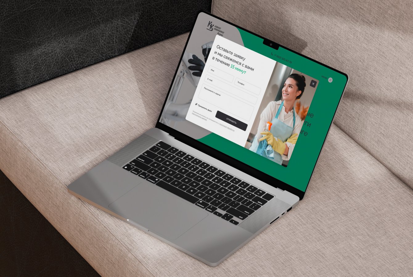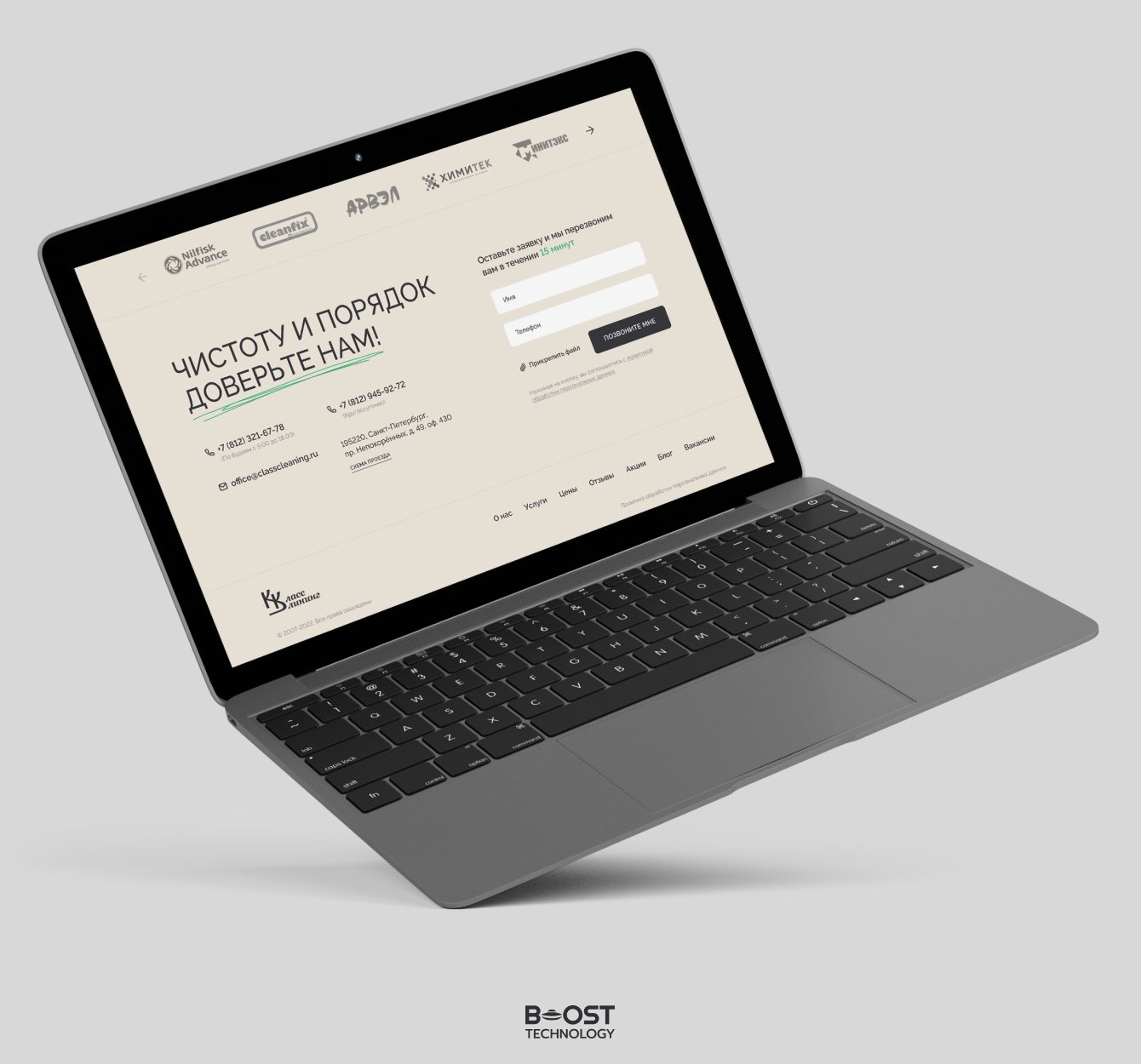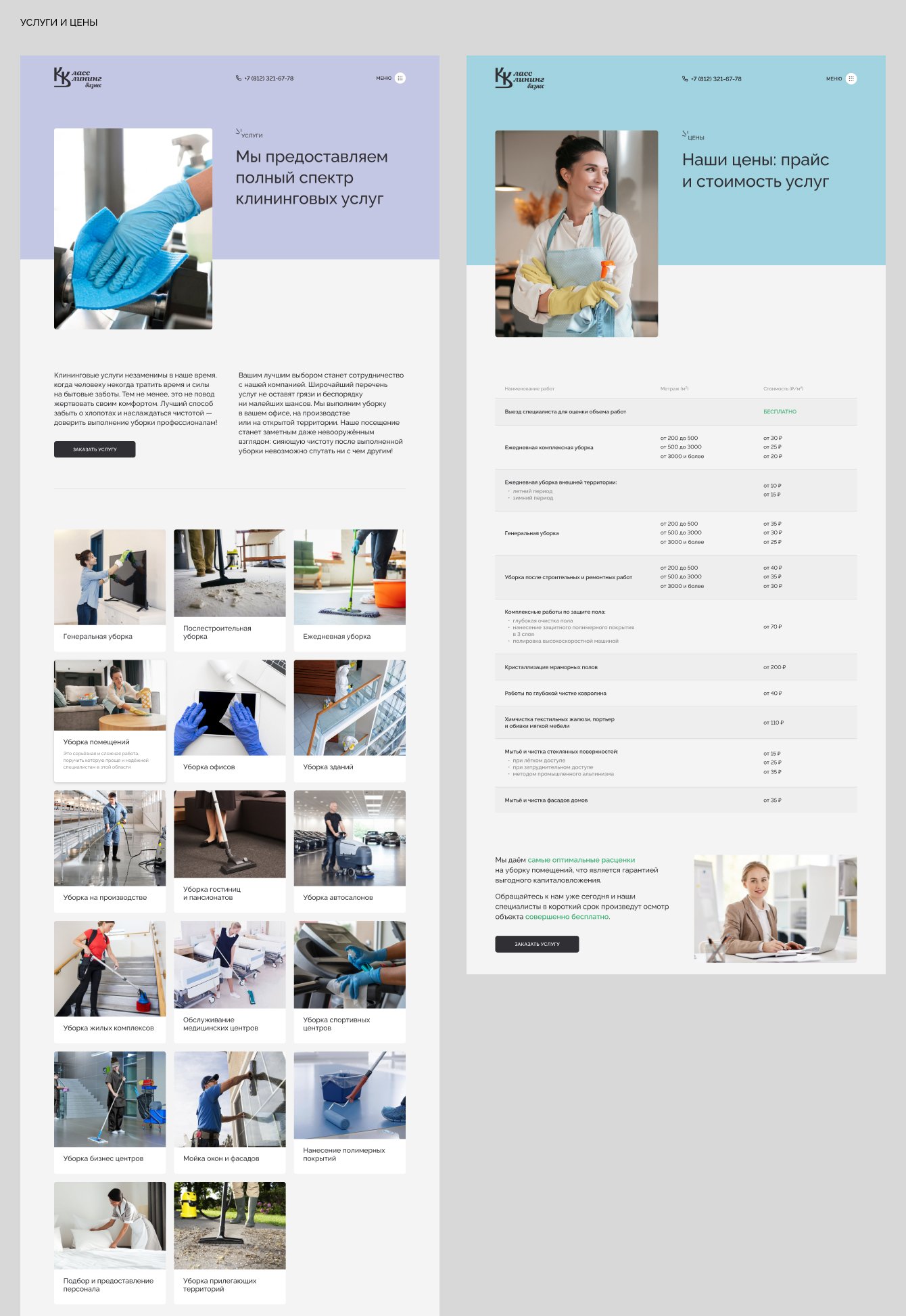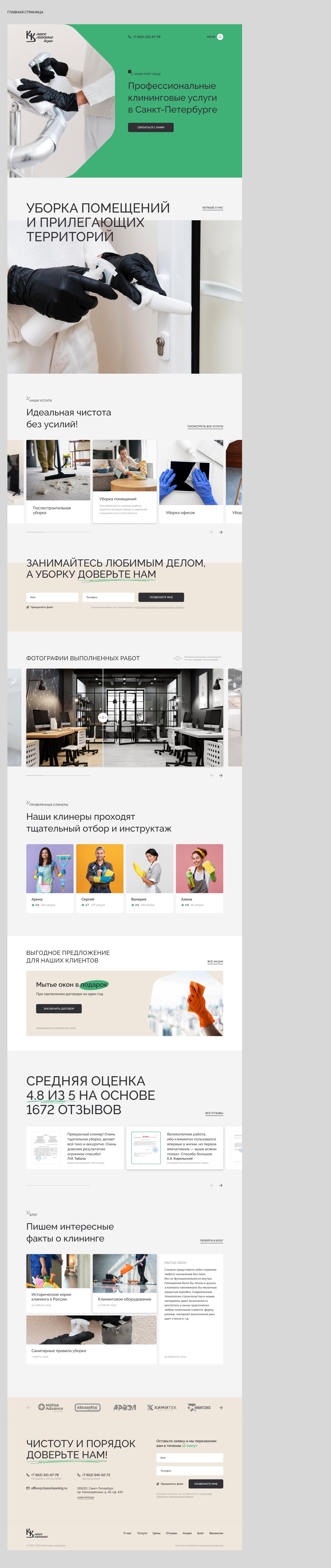 - Разработали дизайн с обилием фотографий для демонстрации результатов работы компании. За основу взяли цвета — зелёный, светло-серый и бежевый, которые создают ощущение чистоты и порядка.