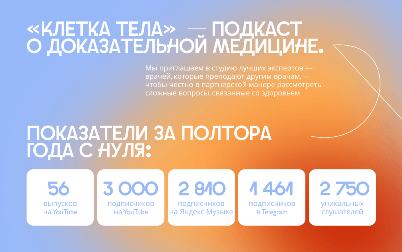 Содержательный диалог между ведущими подкаста и врачом дает возможность любому слушателю без медицинского образования составить полную картину того или иного заболевания или медицинской проблемы и заодно избавиться от ошибочных представлений и стереотипов.