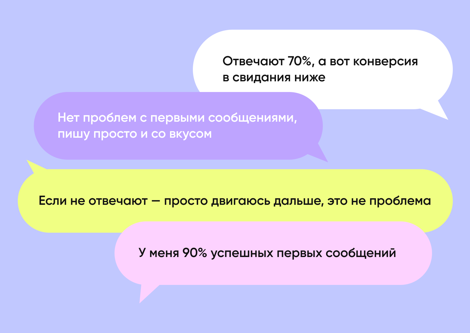 Итак, мы поговорили с пользователями и узнали, что они уверены в себе, знают, что писать в первом сообщении и как продолжить диалог. По возможности стараются пообщаться вживую или созвониться.