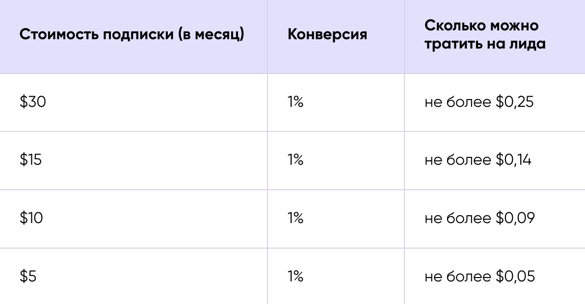 Для всех вариантов оставили конверсию в 1% из лида в покупателя — вполне достижимая цифра даже для нового продукта, если правильно донести до пользователя ценность.