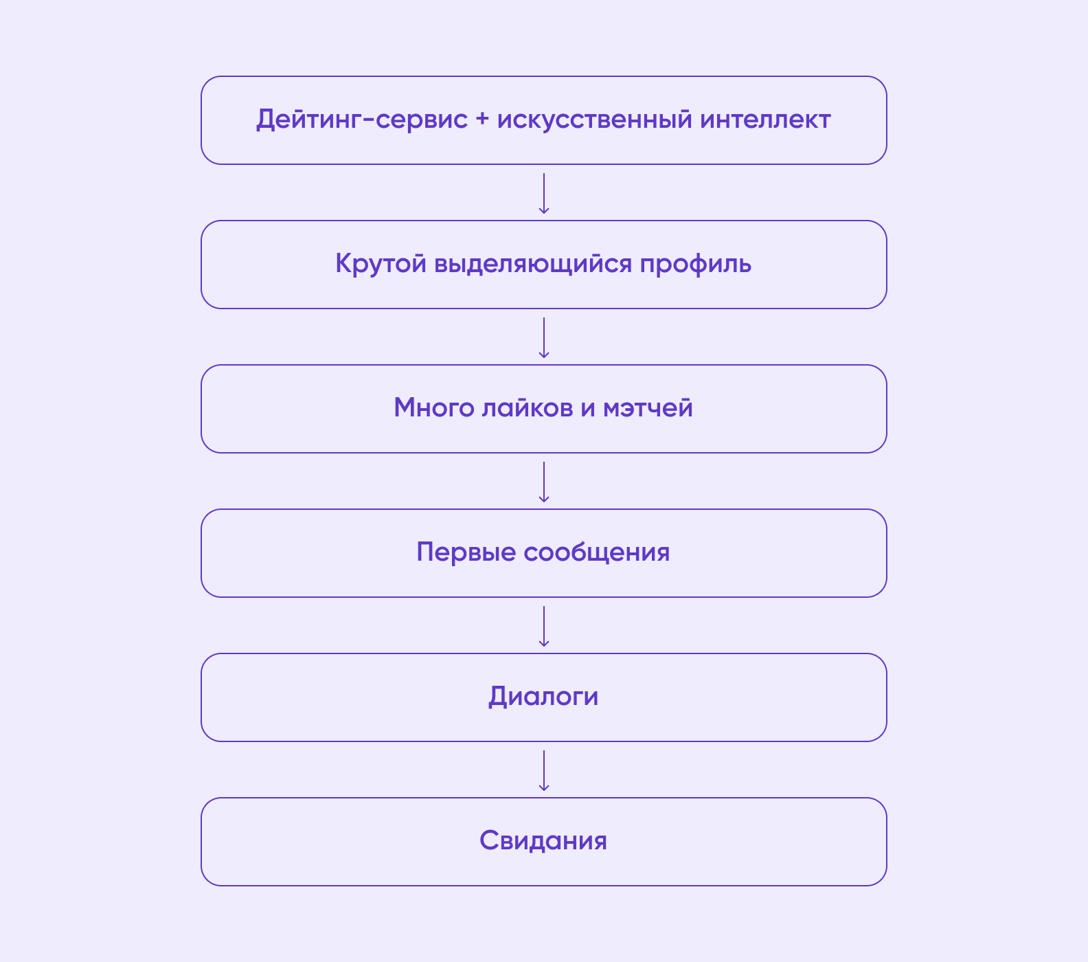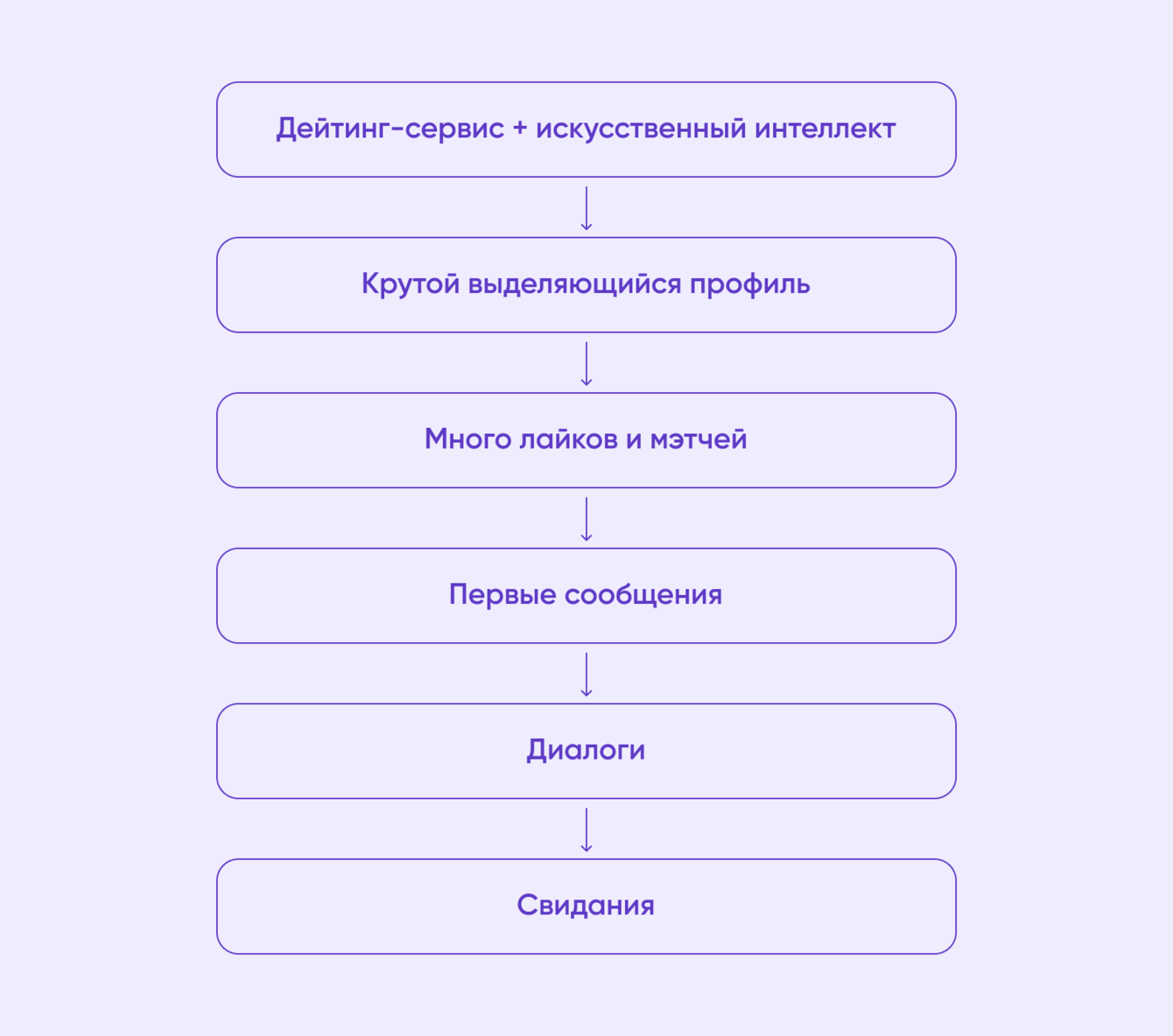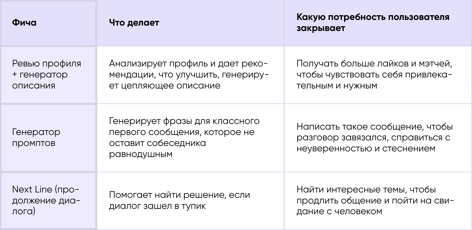 В рамках анализа Jobs to be done каждую фичу будущего продукта мы переводим в потребность человека. Нас интересуют не функции сами по себе, а их возможность эффективно решать задачи целевой аудитории. Вот как это выглядит в концепции дейтинг-сервиса с ИИ.