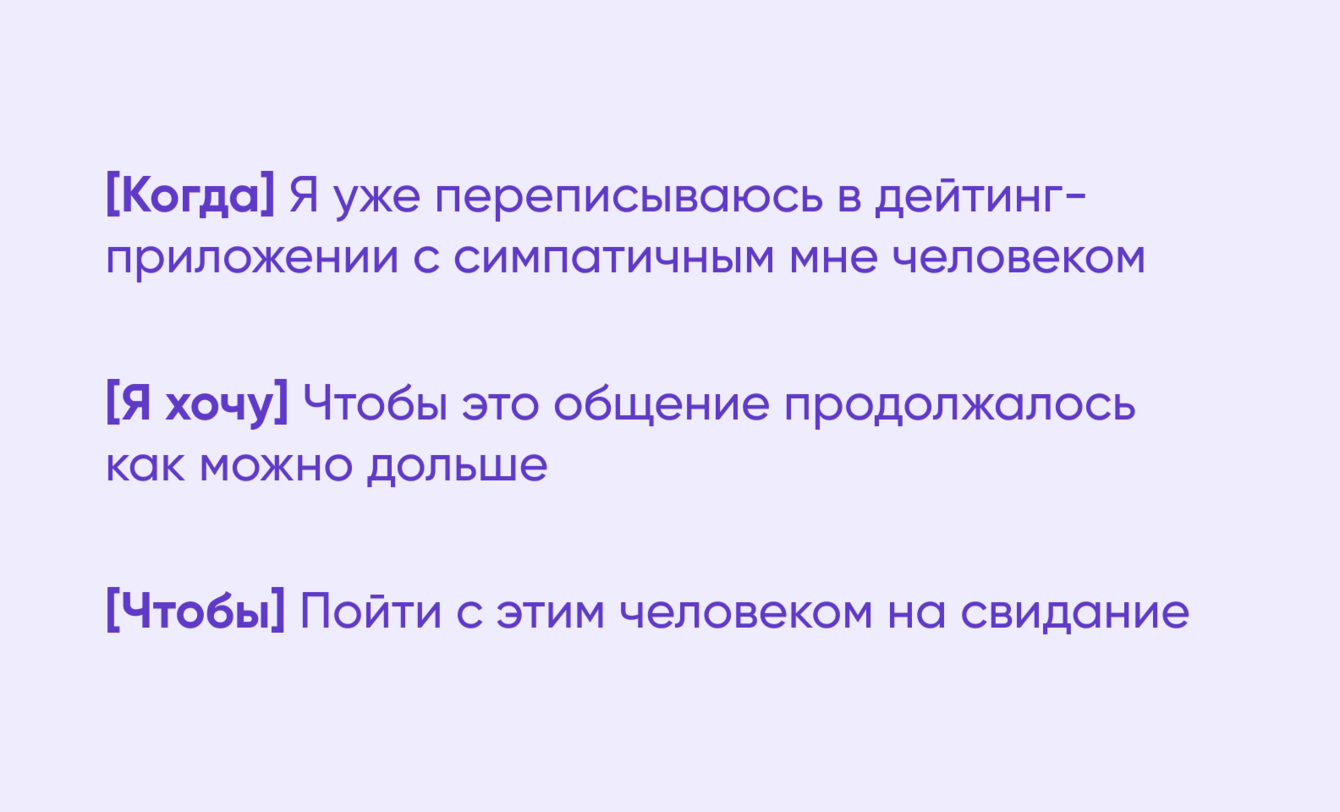 Дальше нужно было сформулировать гипотезы, которые нам предстояло проверить в ходе качественных и количественных исследований. Для этого мы использовали формулу из фреймворка Jobs to be done: «Когда [ситуация], я хочу [мотивация], чтобы [ожидаемый результат]».