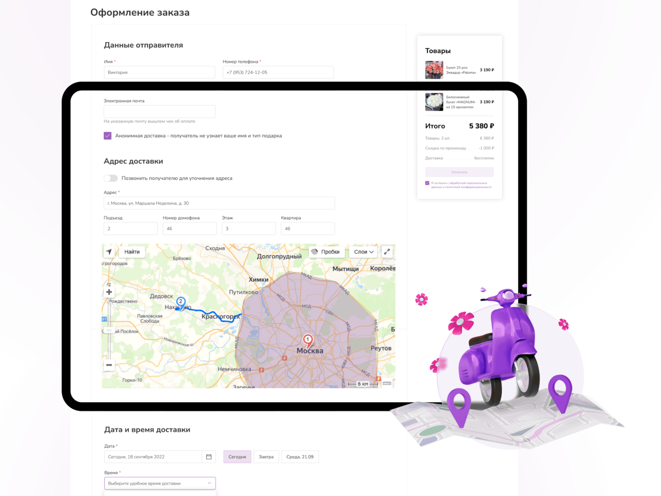 Расчет стоимости — только полдела. Дальше мы разбирались с учетом времени. Если магазин открывается завтра в 10:00, а клиент делает заказ сегодня в 21:00 вечера, он не сможет получить доставку в 10 утра. Флористам и курьерам нужно время, чтобы собрать и доставить букет. Система это понимала и автоматически добавляла к началу рабочего дня необходимый временной интервал, и предлагала ближайшее доступное время, например, 12:00.