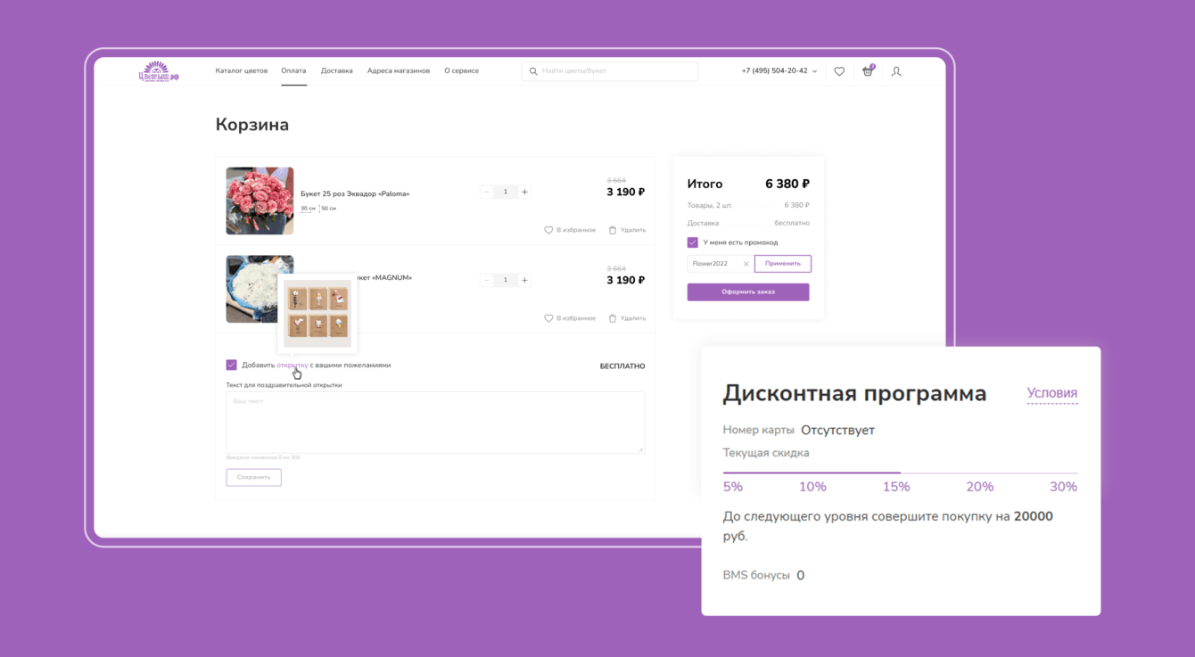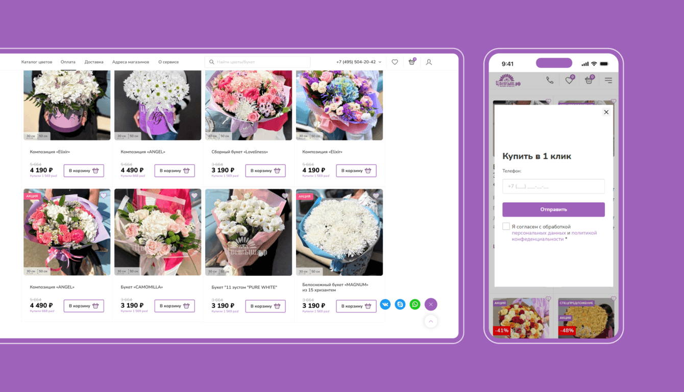 Затем добрались до фильтров, карточек и каталога. Убрали обязательную регистрацию перед покупкой, потому что многих этот шаг отталкивает. Теперь можно купить букет по номеру телефона.